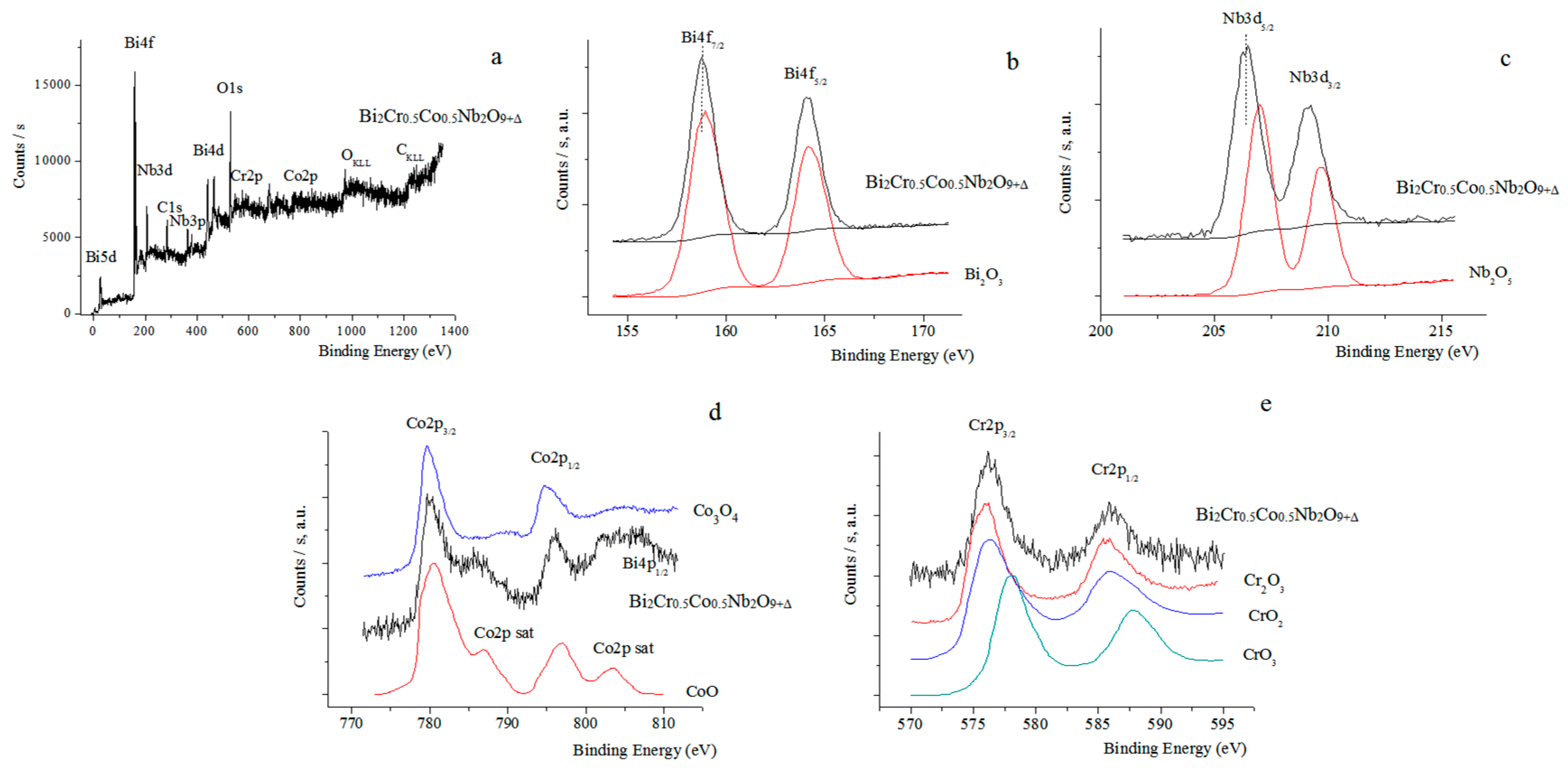 - Badanina, K.A.; Nekipelov, S.V.; Lebedev, A.M.; Zhuk, N.A.; Beznosikov, D.S. Conversion of Cr(III) and Co(III) During the Synthesis of Co/Cr Codoped Bismuth Niobate Pyrochlore According to NEXAFS Data. J. Sib. Fed. Univ. Math. Phys. 2024, 17, 559–569. [Google Scholar]