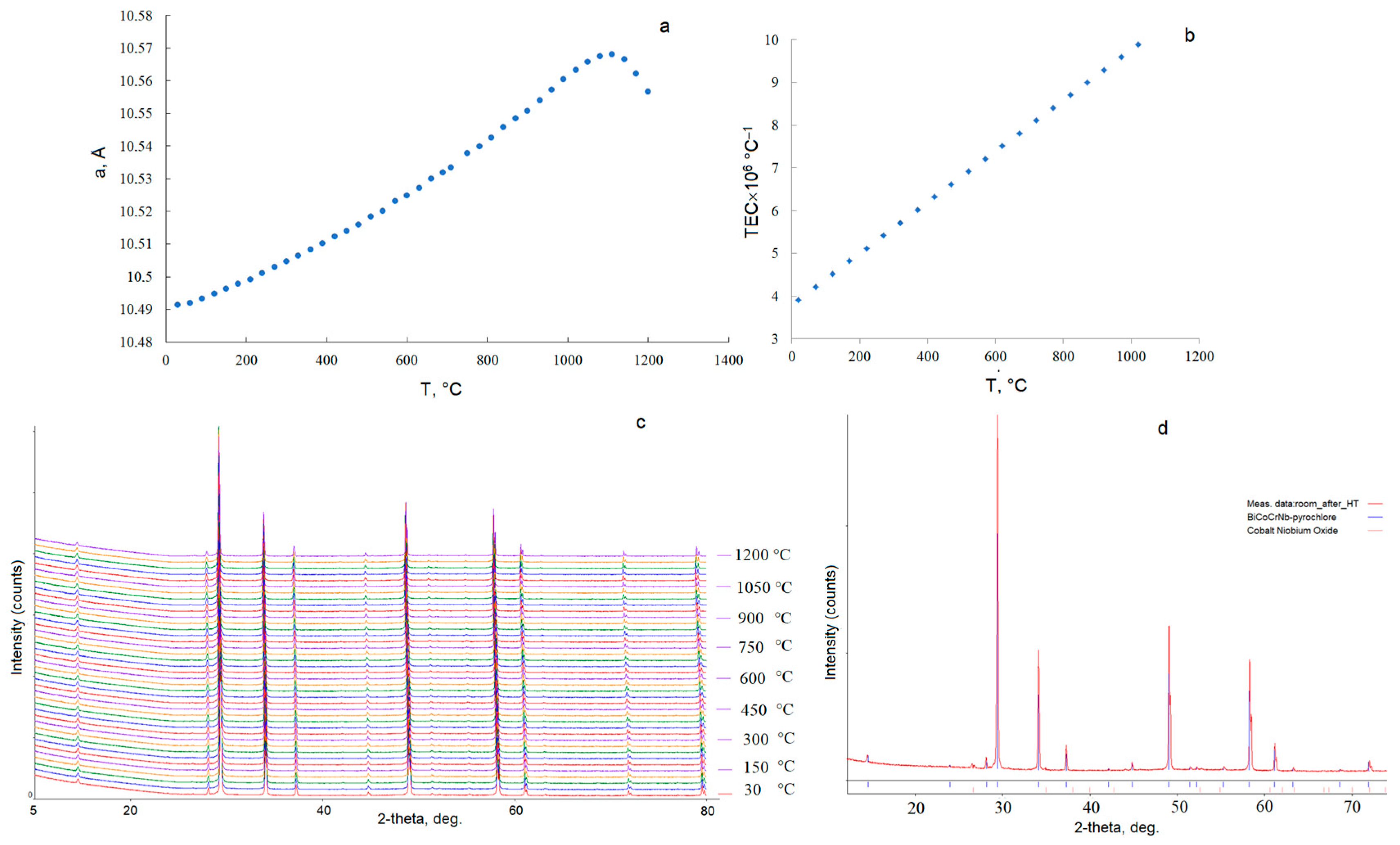 - Zhuk, N.A.; Krzhizhanovskaya, M.G. Thermal expansion of bismuth magnesium tantalate and niobate pyrochlores. Ceram. Int. 2021, 47, 30099–30105. [Google Scholar] [CrossRef]