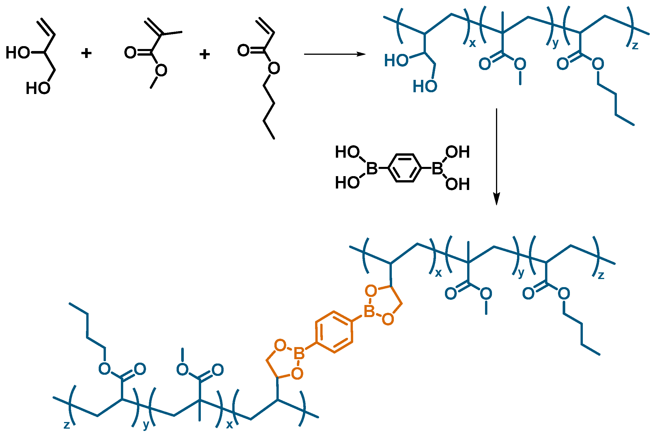 - Cromwell, O.R.; Chung, J.; Guan, Z. Malleable and self-Healing covalent polymer networks through tunable dynamic boronic ester bonds. J. Am. Chem. Soc. 2015, 137, 6492–6495. [Google Scholar] [CrossRef] [PubMed]