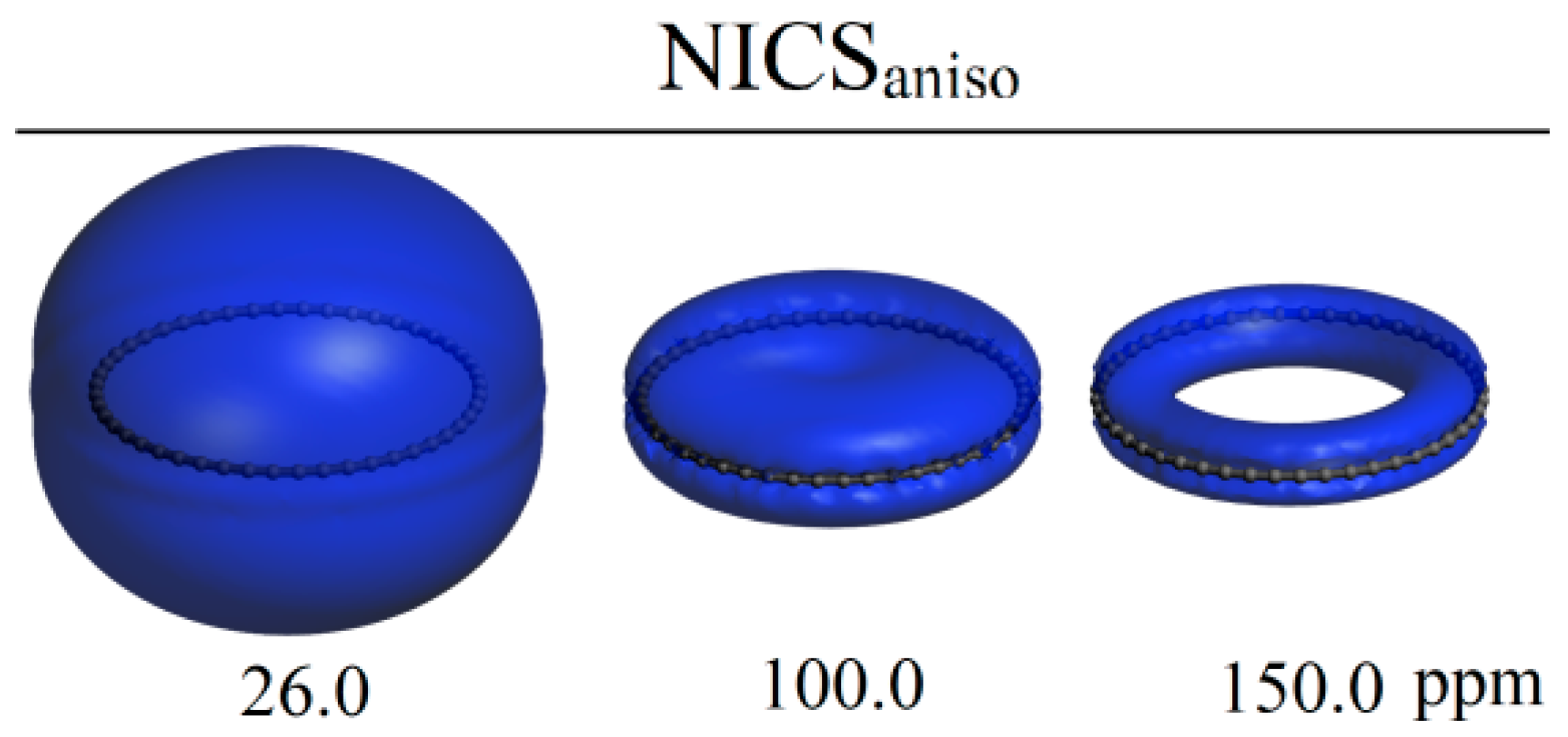 - Charistos, N.D.; Muñoz-Castro, A. Induced Magnetic Field in Sp-Hybridized Carbon Rings: Analysis of Double Aromaticity and Antiaromaticity in Cyclo[2N]Carbon Allotropes. Phys. Chem. Chem. Phys. 2020, 22, 9240–9249. [Google Scholar] [CrossRef]
