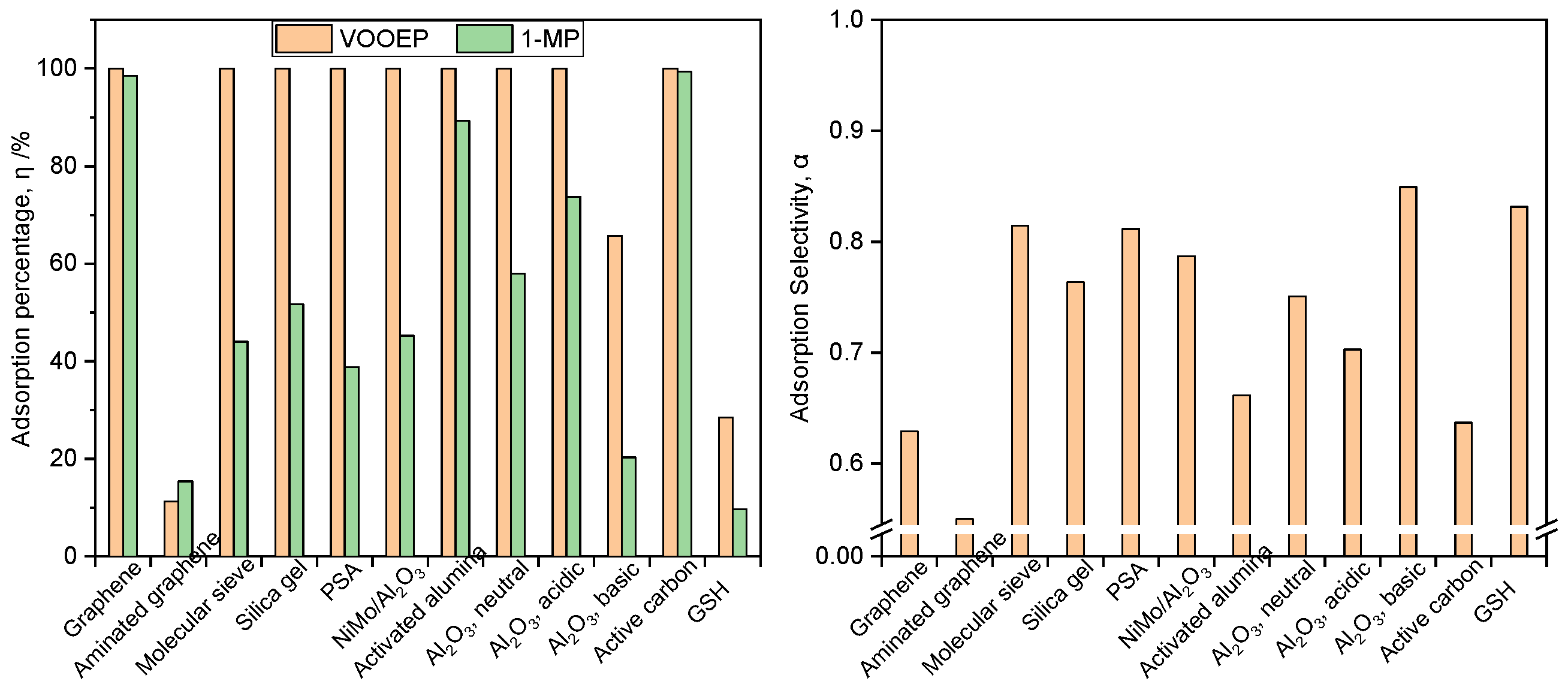 Figure 3, the order for adsorption percentage and selectivity differed significantly. The order of adsorption percentage for VOOEP among different adsorbents is as follows: graphene ≈ molecular sieve ≈ silica gel ≈ PSA ≈ NiMo/Al