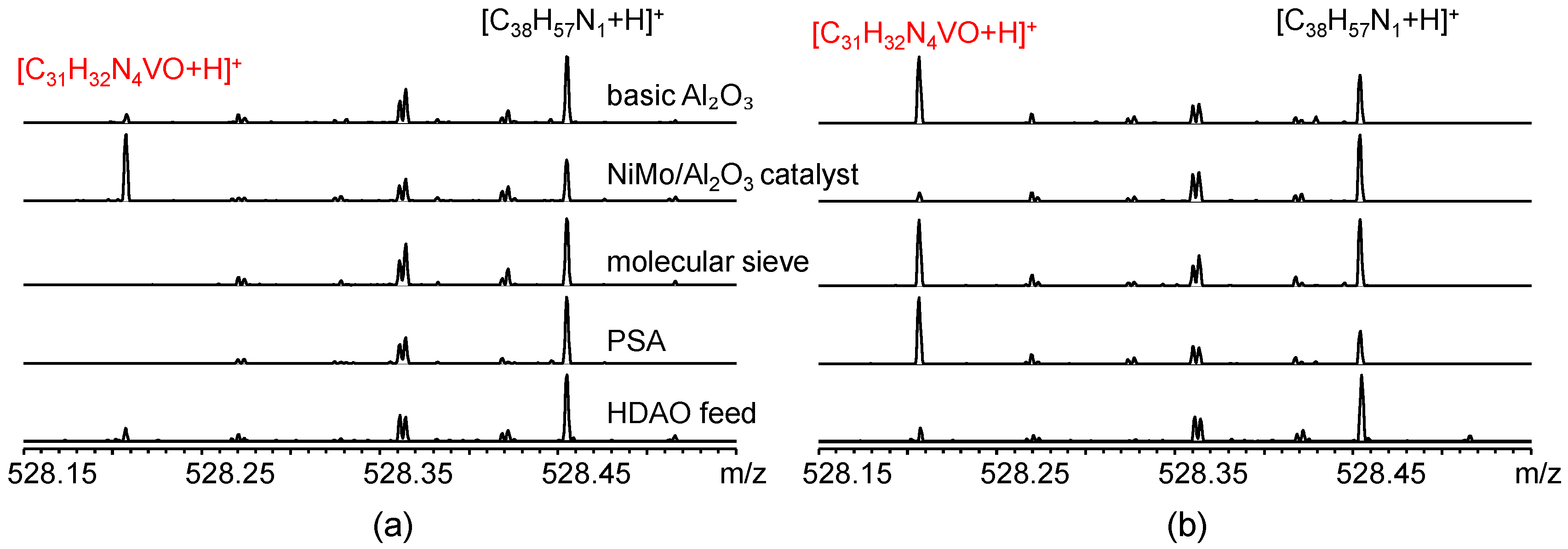 Approximately 0.8 g of HDAO was weighed into a 50 mL conical flask and fully dissolved in 40 mL of n-heptane via ultrasonication. A pre-weighed amount of adsorbent was then added to achieve adsorbent-to-oil mass ratios of approximately 0.33. The flask was placed in a constant-temperature water bath shaker at 20 °C for 24 h. Then the remaining oil and the adsorbent were separated by centrifuge. The separated adsorbent was transferred to a solid phase extraction (SPE) column. Sequential elution was performed using n-heptane, toluene, a toluene/methanol mixture (50:50, v/v), and finally methanol to obtain the adsorbed oil. Both the remaining oil and the adsorbed oil were analyzed by positive-ion electrospray ionization (+ESI) Orbitrap mass spectrometry (MS) and inductively coupled plasma optical emission spectrometer (ICP-OES) for elemental analysis. The HDAO samples were diluted by a toluene/methanol mixture (50:50, v/v) to a final concentration of 0.2 mg/mL to infuse into MS. The +ESI MS operating conditions were as follows: spray voltage 3600 V, ion transfer tube temperature 300 °C, nitrogen sheath gas flow rate 8.0 arbitrary units (au), auxiliary gas flow rate 3.0 au, mass range m/z 200–1000. Regarding the ICP-OES analysis, the detailed procedure was as follows: The HDAO samples were first burned at 750 °C for 5 h, and the resulting ash was dissolved in a HNO3–HCl mixture solution (acid digestion), then diluted to 10 mL with water to be analyzed by ICP-OES. The quantification of vanadium was performed using ICP-OES at the V emission line of 292.460 nm.