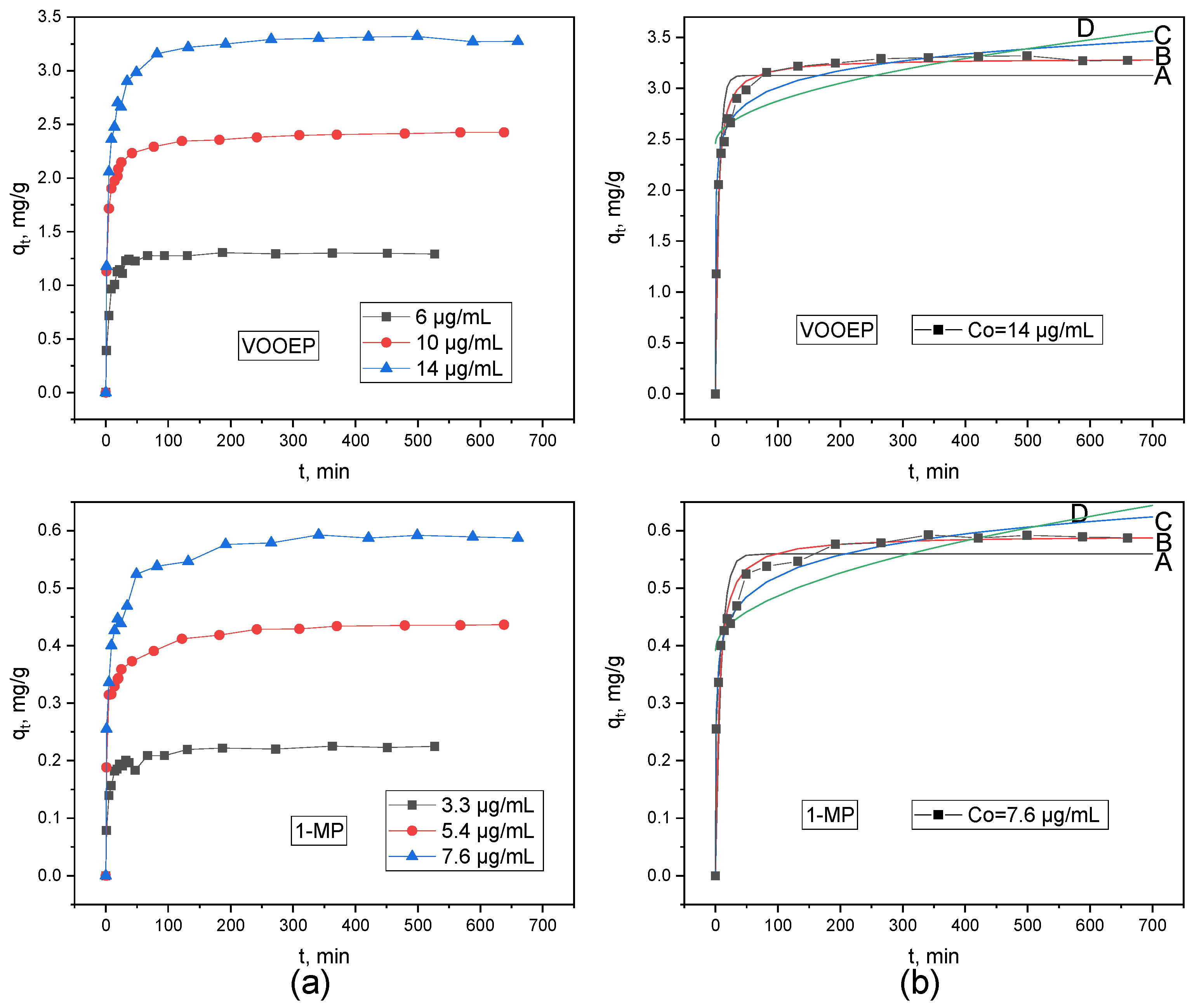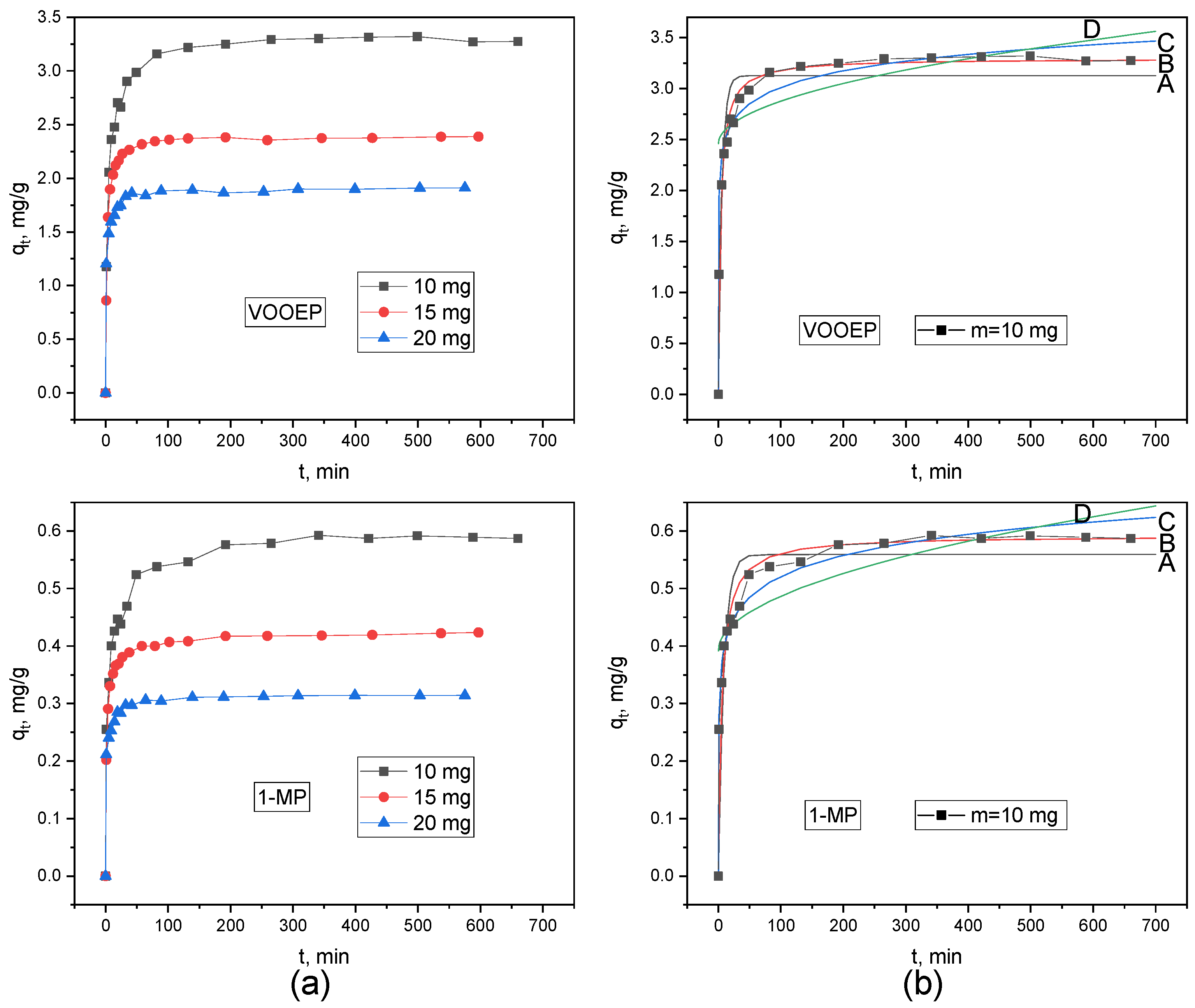 Figure 6a shows the experimental curves for the adsorption of VOOEP and 1-MP on PSA at different adsorbent dosages. The overall trends of all curves are similar. At the beginning of adsorption (t < 100 min), the adsorption rate for both VOOEP and 1-MP is fast, and the adsorption capacity increases rapidly due to the abundance of vacant adsorption sites on PSA. As adsorption proceeds, the number of available sites on PSA gradually decreases, slowing down the adsorption rate for VOOEP and 1-MP. The increase in adsorption capacity gradually slows and eventually reaches equilibrium. As the PSA dosage increased from 10 mg to 20 mg, the equilibrium adsorption capacity (