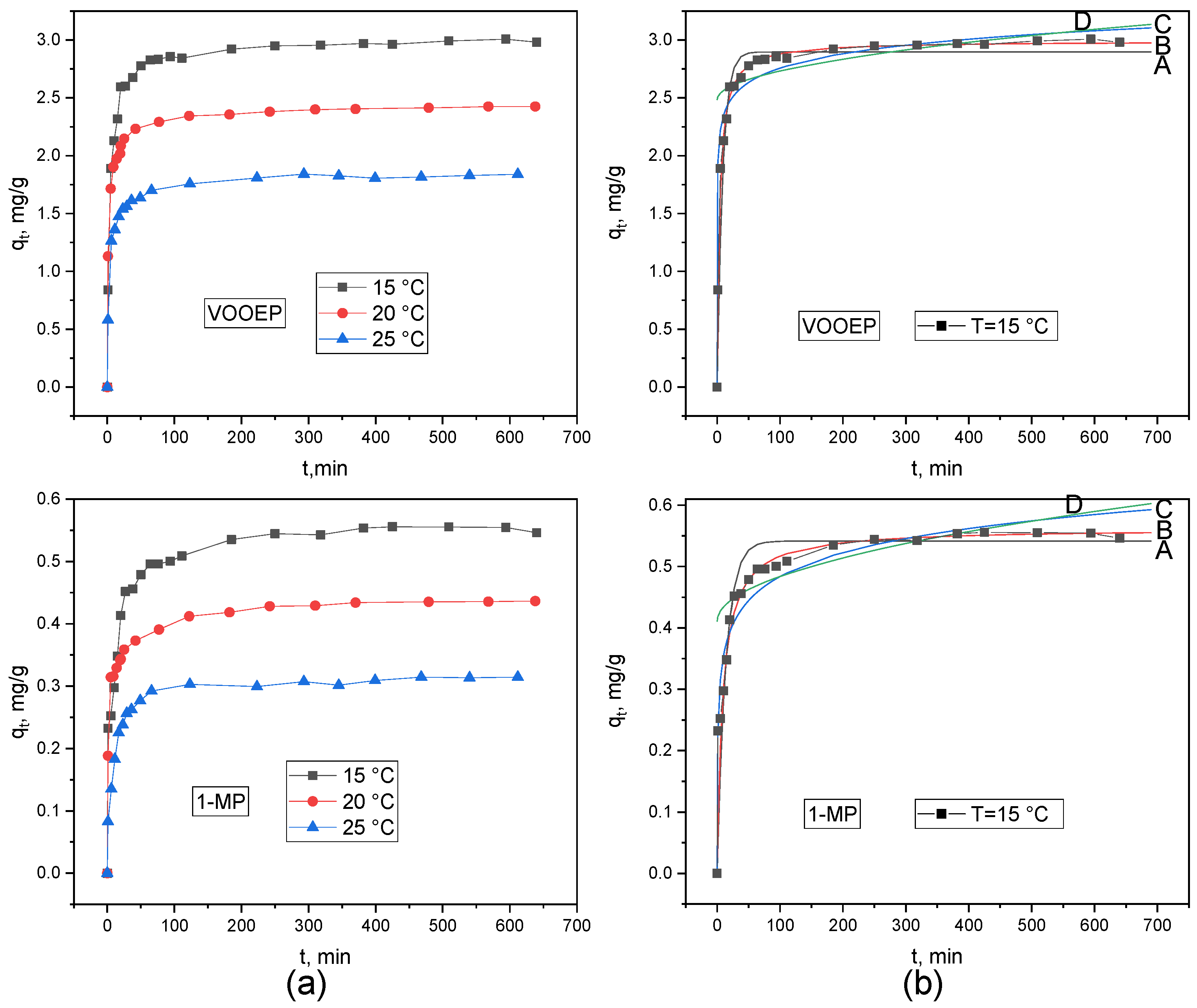 qt) of PSA for VOOEP and 1-MP at different times was calculated using Equation (4). The procedure was repeated at temperatures set to 15 °C and 25 °C.