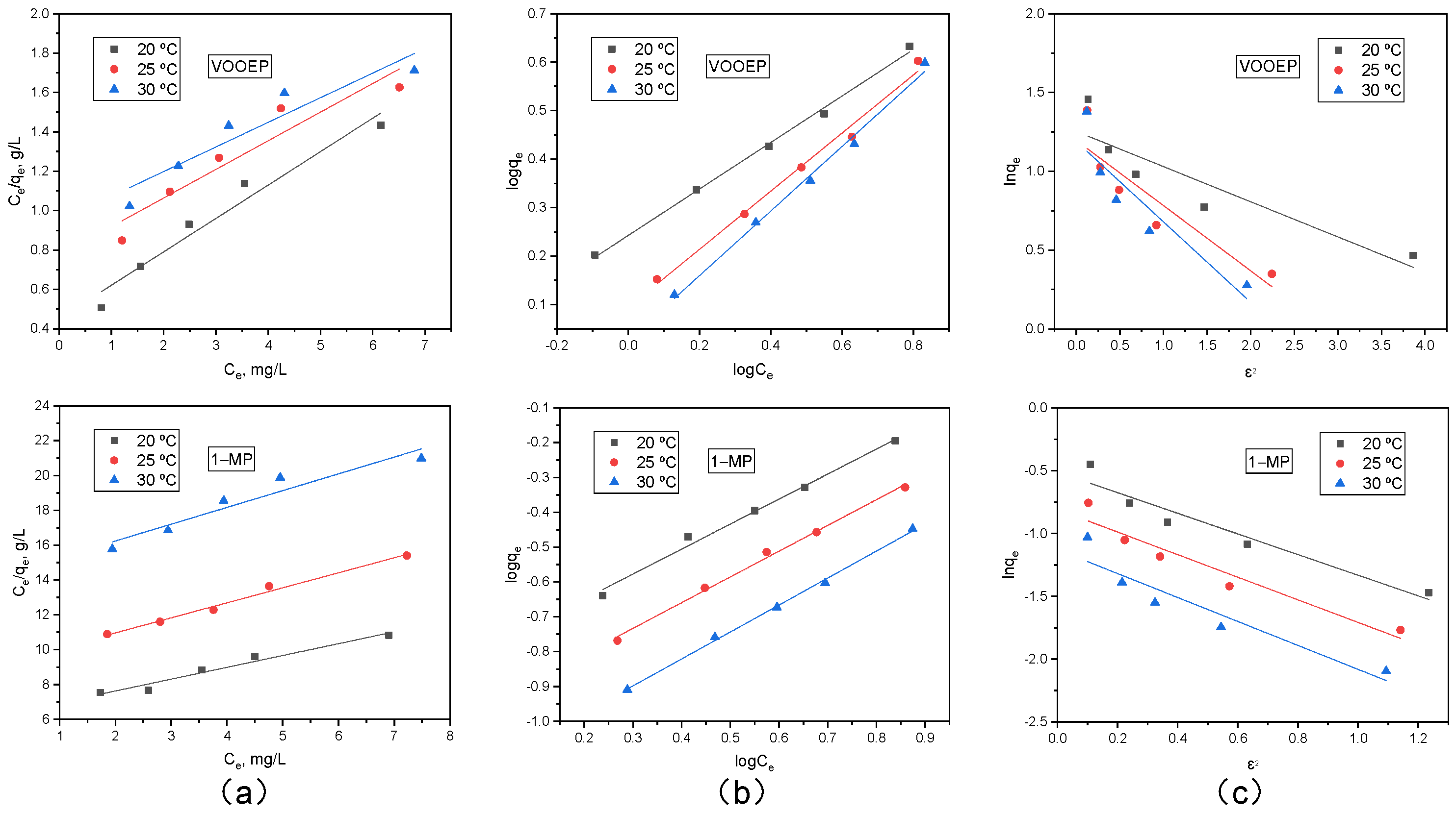 To gain deeper insight into the interaction between the adsorbates and PSA, the experimental data for VOOEP and 1-MP at three different temperatures (20, 25, 30 °C) were fitted using the Langmuir, Freundlich, and Dubinin-Radushkevich (D-R) adsorption isotherm equations. The resulting fitting curves are presented in