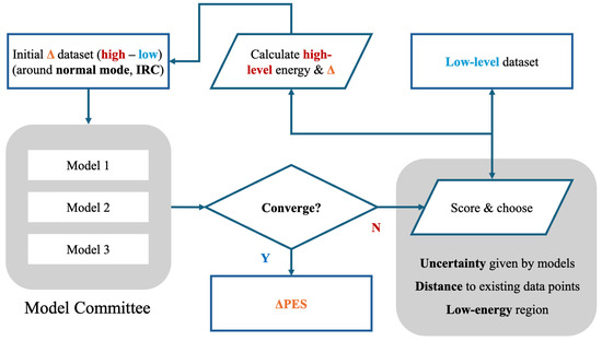 An active Δ machine learning workflow. It starts at a Δ dataset (difference between high-level and low-level) and it contains stationary points and some points along the normal modes and IRC for reactive systems. Models 1–3 are the members of the PIP-NN committee initialized with different random seeds. They are trained on the current dataset independently to estimate the prediction uncertainty. Then, the low-level dataset is scored and a subset is chosen for high-level labeling. By repeating this process the Δ dataset can be expanded. The active learning loop is considered converged when the Root Mean Squared Error (RMSE) of the model on the validation set stabilizes, in other words, the decrease is negligible after adding new points. The final ΔPES can be used in further simulations.