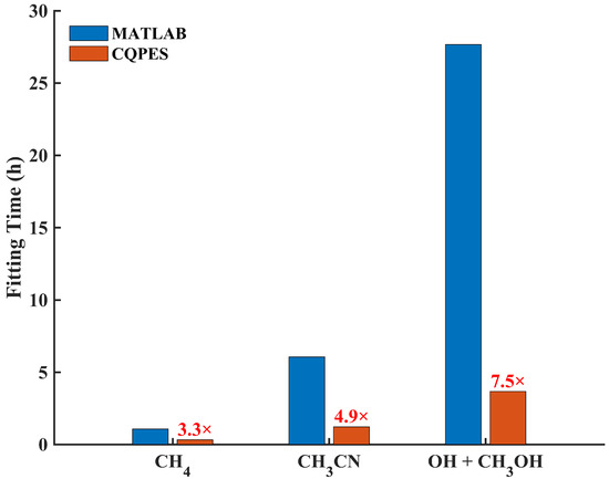 Comparison of the averaged fitting time by MATLAB and CQPES for the CH4, CH3CN, and OH + CH3OH system.