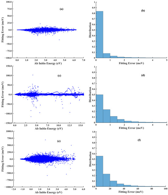 The MAE and RMSE for each dataset are summarized in Table 4. The total RMSEs were 0.86 meV by CQPES and 0.81 meV by MATLAB, both of which are accurate enough. However, the training by CQPES was 2.3 times faster than by MATLAB, as shown in Table 5 and Figure 3. The scattered fitting error and the distribution of the absolute fitting errors by CQPES are shown in Figure 4a,b, respectively. As shown in Table 5 and Figure 3, the training on a 32-core CPU computing node spent ~1 h with MATLAB, but on an RTX 4090 GPU the current CQPES only took ~20 min. Besides this, several GPUs can be landed on a GPU computing node; one could train several PIP-NNs parallelly within a single node. The efficiency of the PIP-NN deployed by our previous Fortran code and by the ncnn-based implementation was compared (ncnn v20250916). The ncnn is a high-performance NN computing framework, which is highly optimized for mobile platforms, and also provides Streaming SIMD Extension (SSE) and Advanced Vector Extension (AVX, AVX2, and AVX512) acceleration instructions under x86-64 platforms [61]. This instruction set of acceleration technologies can improve the efficiency of linear algebra operations, thereby increasing the computational speed of NNs that involve a large number of matrix multiplications. The code was compiled by LLVM-based compilers inside the Intel oneAPI 2023 and ran on an Intel Core i9-13900KF CPU, providing extreme single-core performance. Calculating the energy of the whole CH4 dataset, 97,271 points, took 0.19 s using previous code and 0.14 s using ncnn based code.
