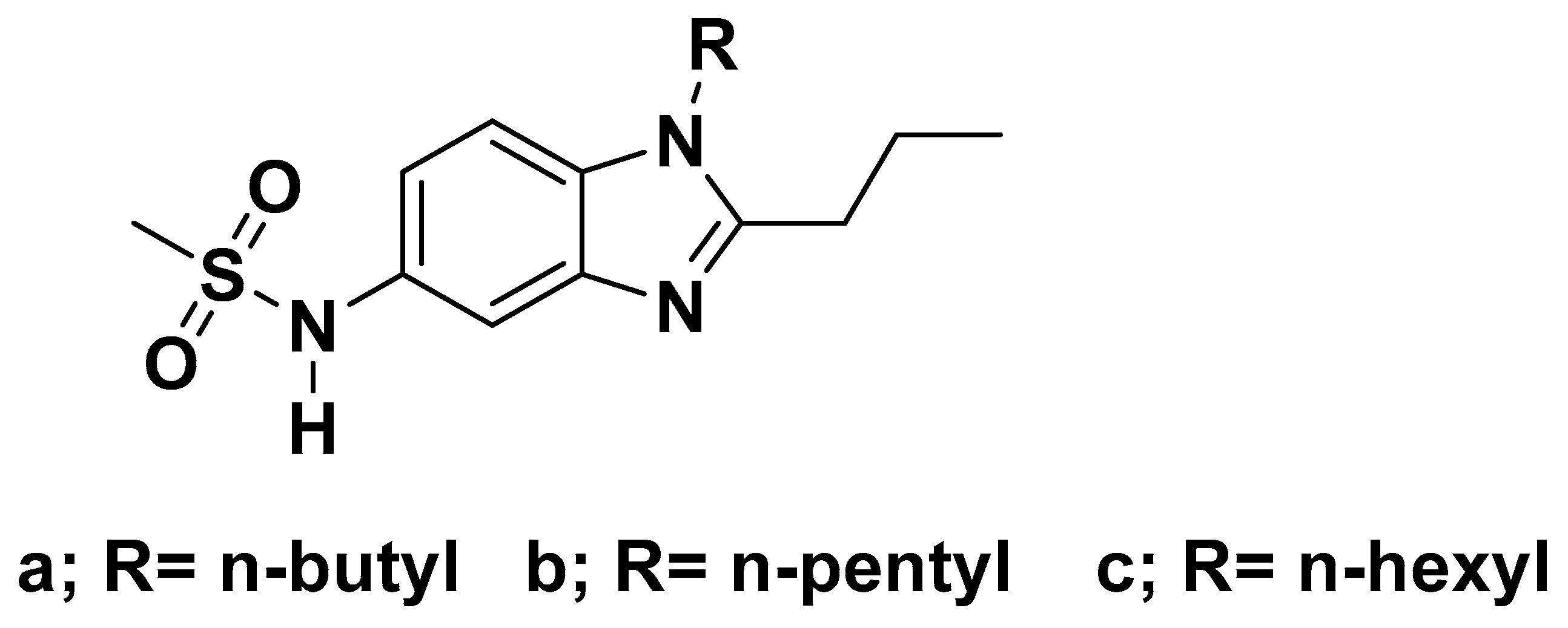 - Khan, M.T.; Razi, M.T.; Jan, S.U.; Mukhtiar, M.; Gul, R.; Hussain, A.; Rabbani, I. Synthesis, characterization and antihypertensive activity of 2-phenyl substituted benzimidazoles. Pak. J. Pharm. Sci 2018, 31, 1067–1074. [Google Scholar] [PubMed]