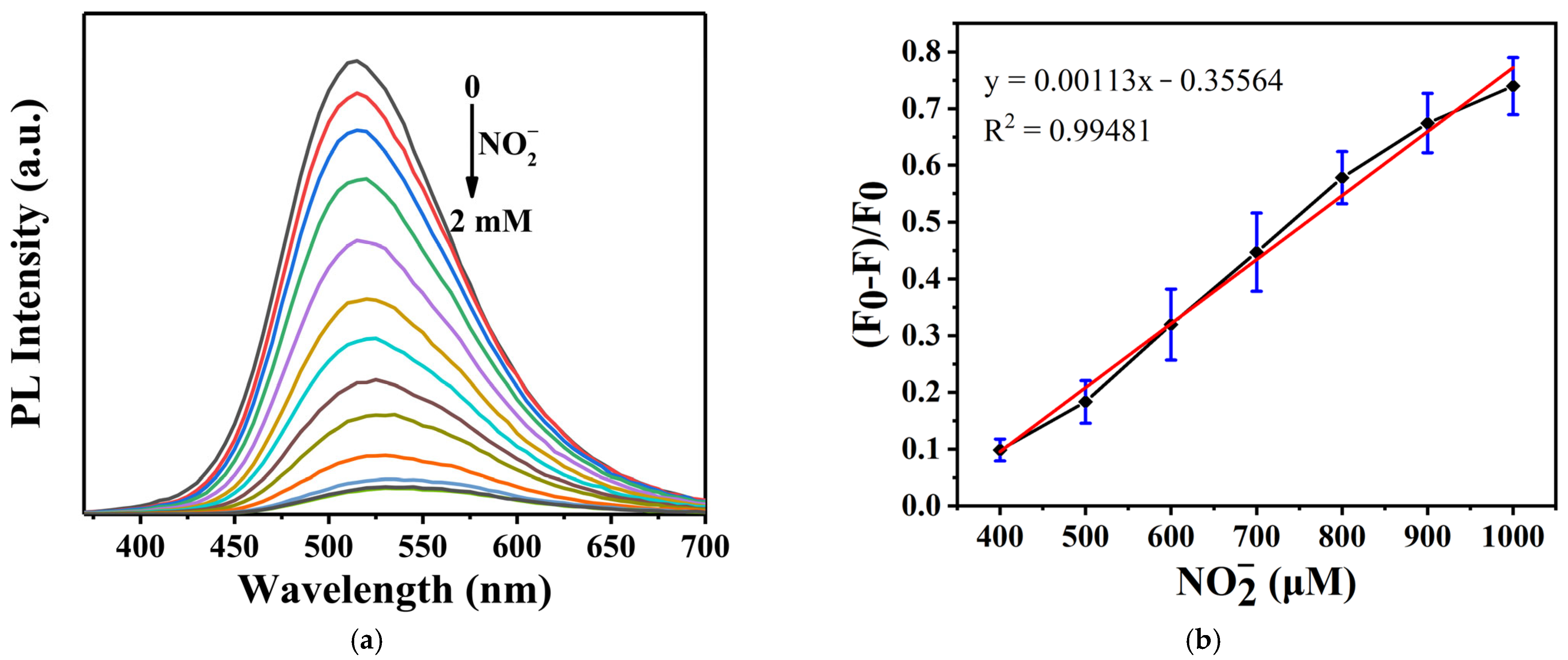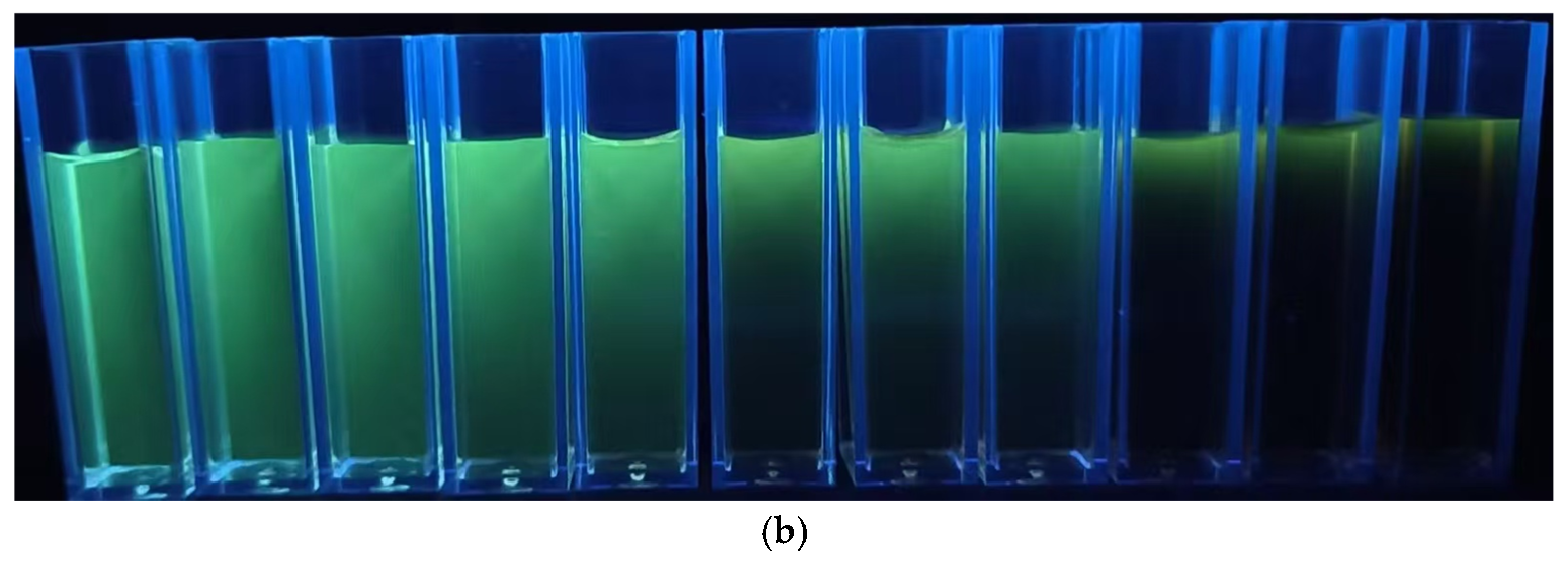 - Tao, H.; Zhang, Z.; Cao, Q.; Li, L.; Xu, S.; Jiang, C.; Li, Y.; Liu, Y. Ratiometric fluorescent sensors for nitrite detection in the environment based on carbon dot/Rhodamine B systems. RSC Adv. 2022, 12, 12655–12662. [Google Scholar] [CrossRef]