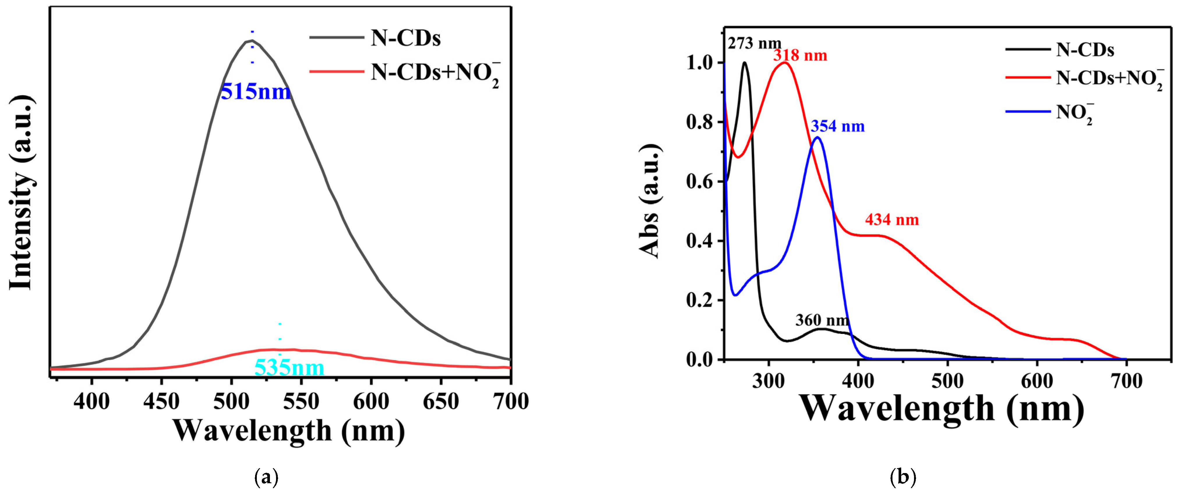 - Zhou, J.; Zhou, X.; Lin, X.; Xia, Y.; Zhao, L.; Huang, K.; Xiong, X.; Yu, H. A dual-mode fluorometric and colorimetric sensor based on N-doped carbon dots for selective and sensitive detection of nitrite in food samples. Sens. Actuators B Chem. 2024, 416, 136045. [Google Scholar] [CrossRef]
