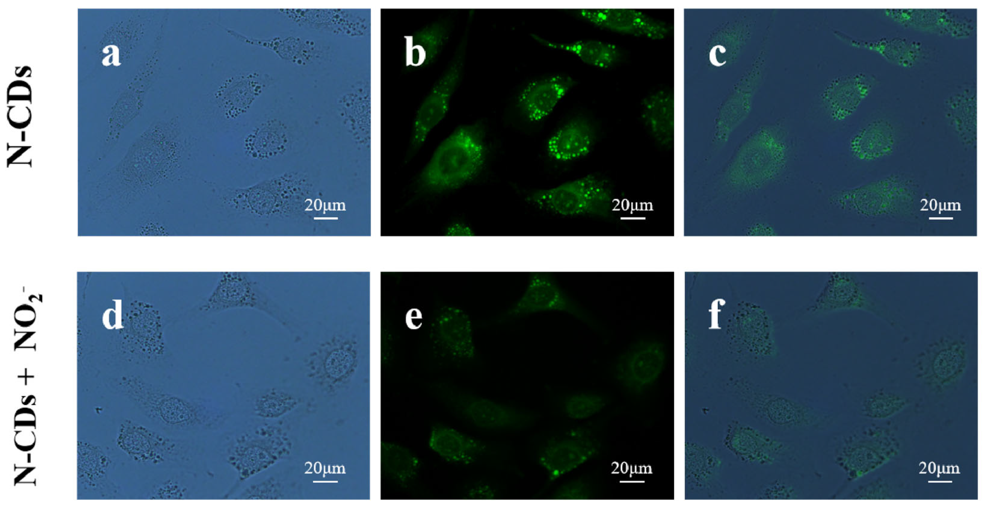 - Liu, Y.; Luo, S.; Wu, P.; Ma, C.; Wu, X.; Xu, M.; Li, W.; Liu, S. Hydrothermal synthesis of green fluorescent nitrogen doped carbon dots for the detection of nitrite and multicolor cellular imaging. Anal. Chim. Acta 2019, 1090, 133–142. [Google Scholar] [CrossRef]