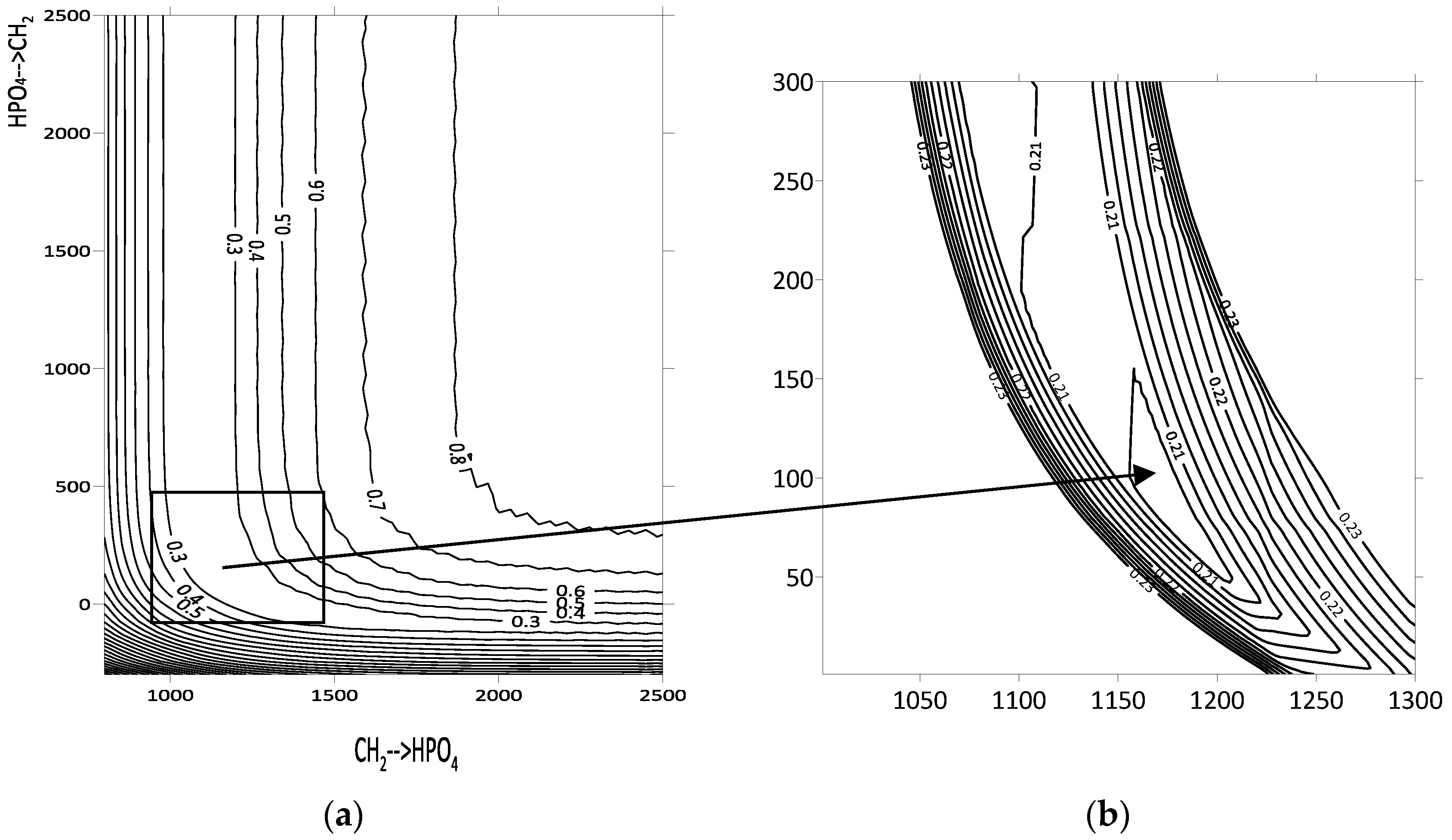 - Secondly, the energy interaction parameters were calculated by minimizing the total deviation between the experimental and modeled via UNIFAC activity coefficients using sequential descent method. The resulting values for the energy interaction parameters are: ACH–HPO4 = 4650, HPO4–ACH = −334, ACCH3–HPO4 = 467, and HPO4–ACCH3 = 680. The refined energy interaction parameters for the aliphatic group are CH2–HPO4 = 1199 and HPO4–CH2 = 54.