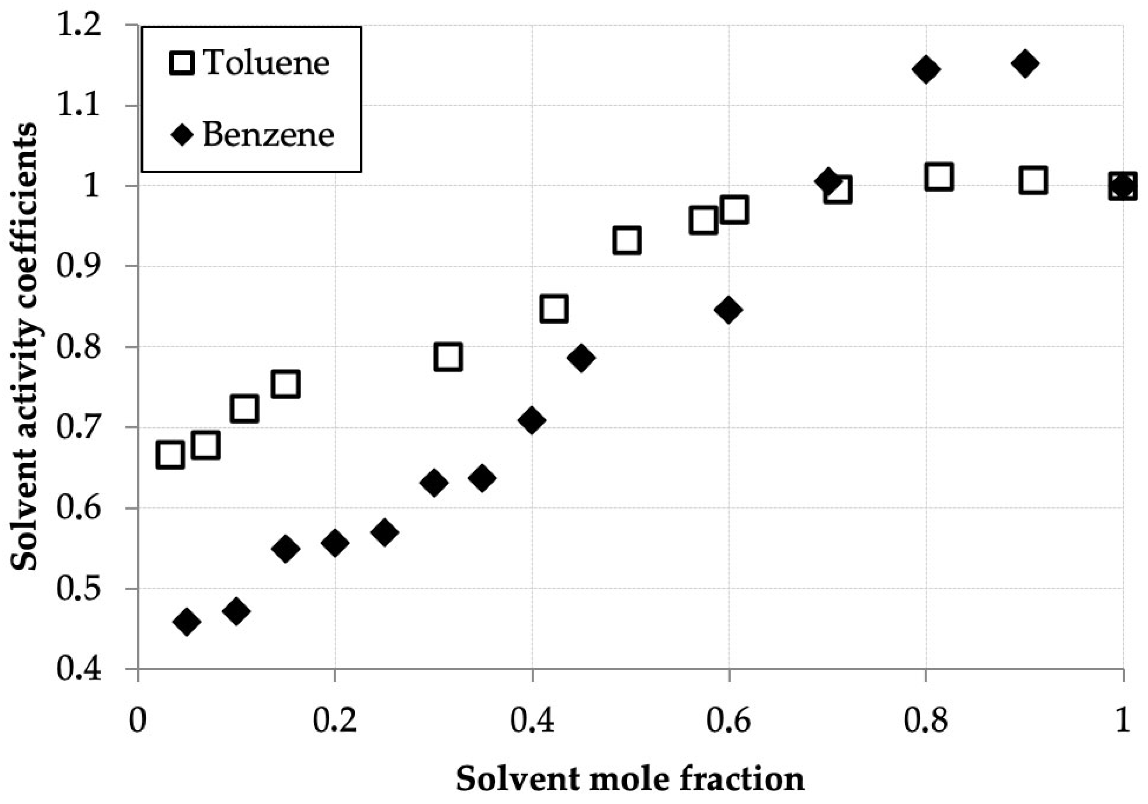 - Firstly, initial experimental determination of the activity coefficient for benzene and toluene in binary systems with D2EHPA was performed by gas chromatography at 293.0 K.