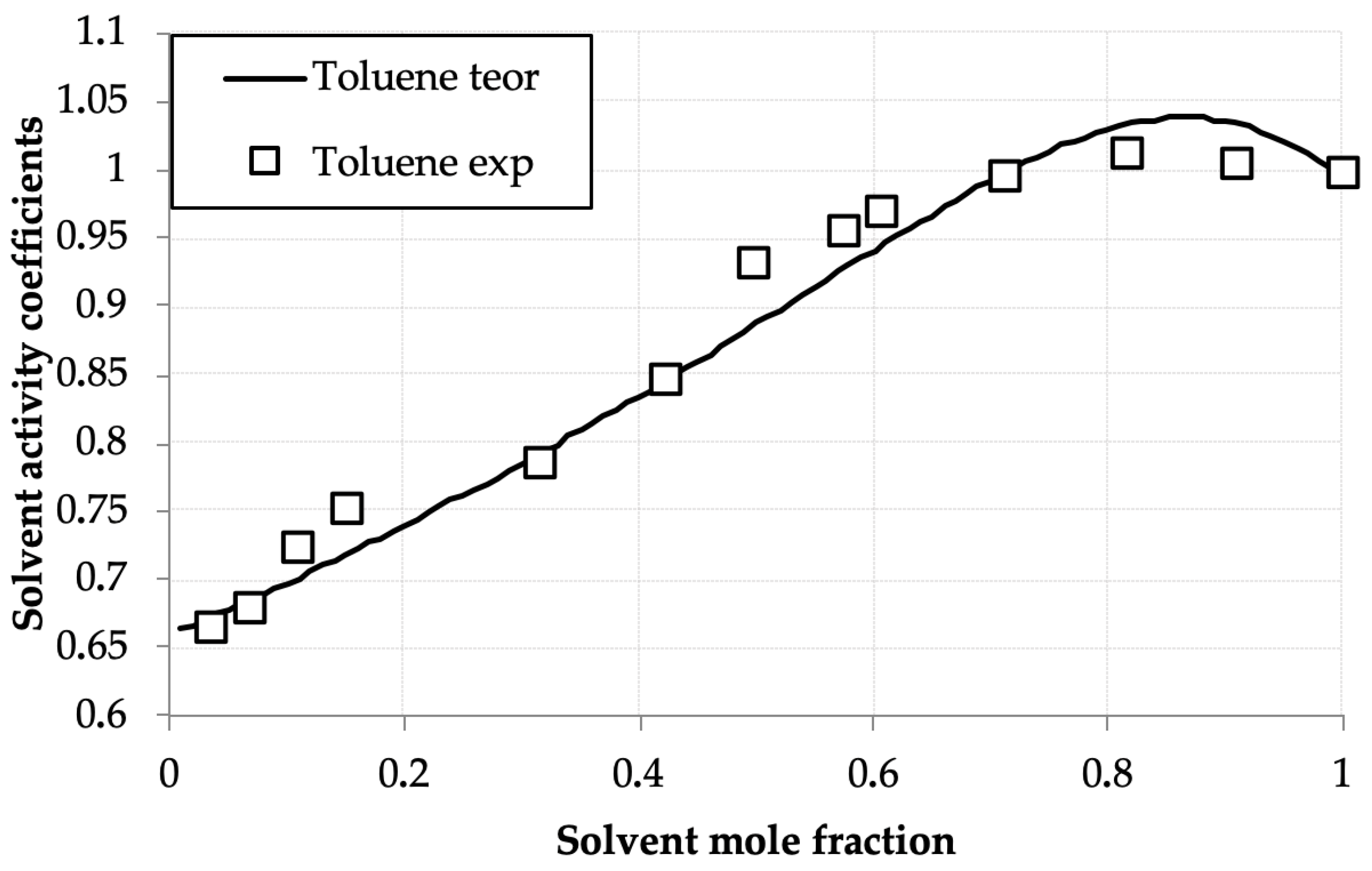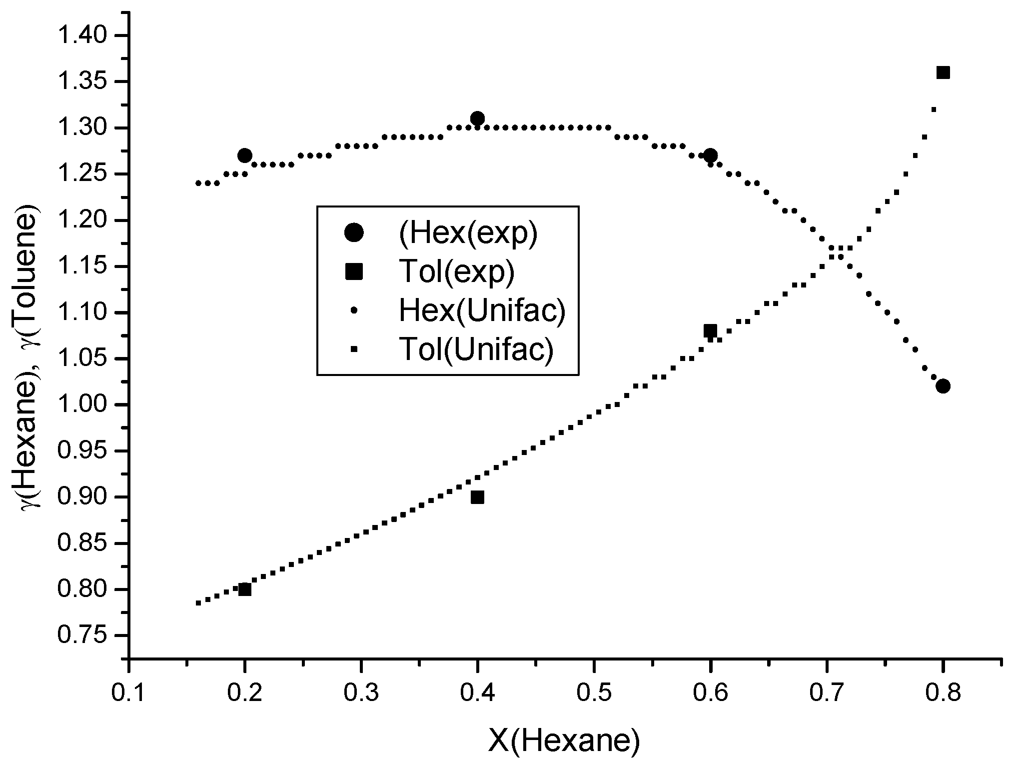 - Thirdly, the parameterized UNIFAC model was applied to calculate activity coefficient of the components of the ternary n-Hexane–Toluene–D2EHPA system, which contains all previously investigated groups. The calculated values were compared with the experimental data for the same system. The significant difference in saturated vapor pressures of n-hexane and toluene necessitated the application of an interim standard. The implementation of the interim standard improved measurement accuracy in systems where the vapor concentration of analytes varied by more than 20 times. The activity coefficient of the volatile components, as calculated by the model, demonstrated good agreement with experimental data.