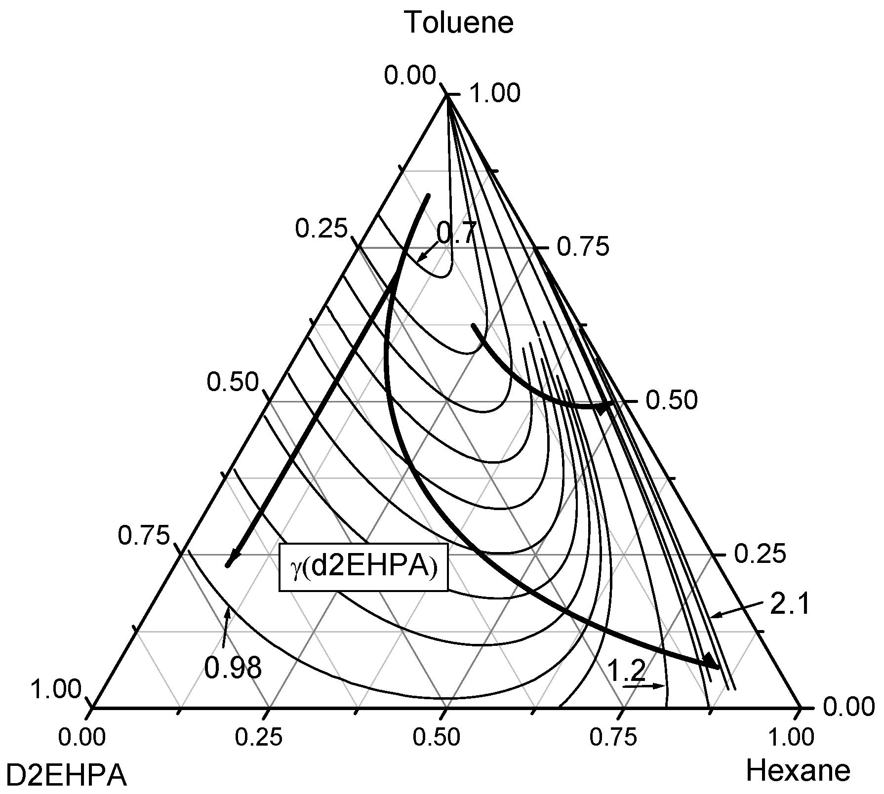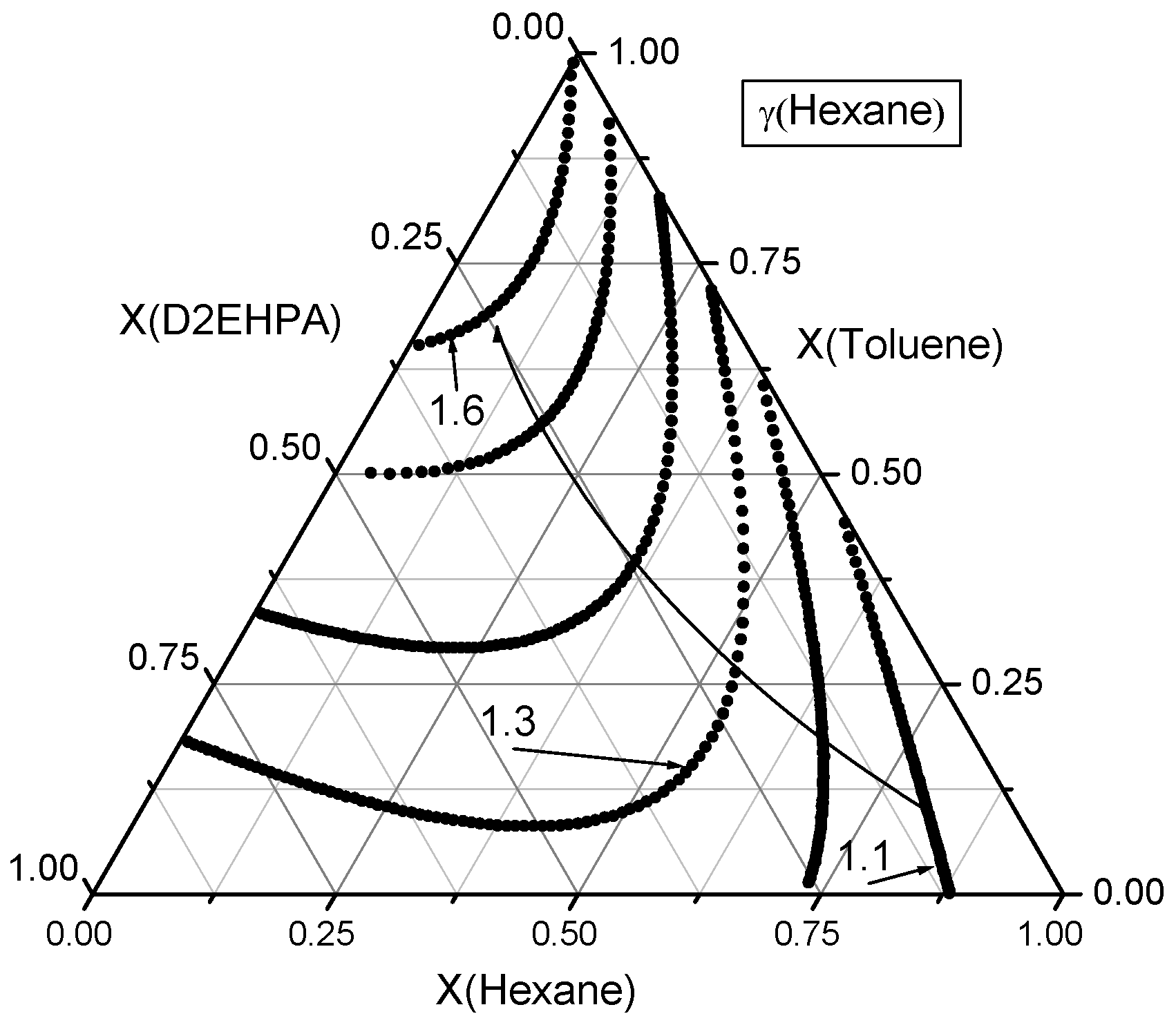 - The final step involved calculating the activity coefficient contour lines for each component in the ternary n–Hexane–Toluene–D2EHPA system. The aliphatic n-hexane acts as a strong driver of non-ideality, significantly increasing the activity coefficients of both toluene and D2EHPA, especially the latter. In contrast, toluene is the primary agent affecting n-hexane’s activity, but also stabilizes the activity coefficient of toluene itself and mitigates the strong non-ideal interactions between n-hexane and D2EHPA. This asymmetric interplay underscores the complexity of multicomponent systems and is critical for optimizing processes like liquid–liquid extraction where such mixtures are encountered.