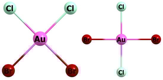Although L.I. Elding et al. [36] suggested that cis- and trans-isomers of [AuCl2Br2] (see Figure 2 for the structures of isomers) should coexist, the experimental spectrum aligns more closely with that of the trans-complex. Therefore, the formation of the cis-isomer can likely be ruled out.