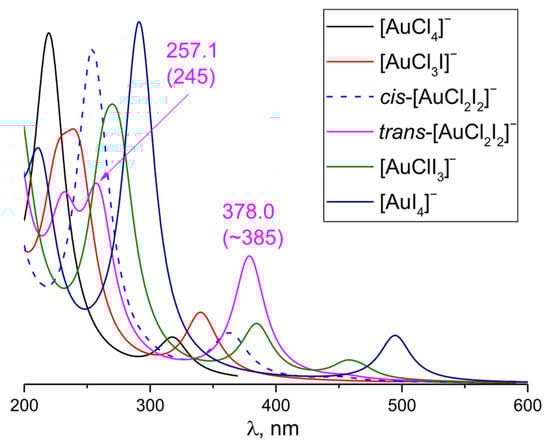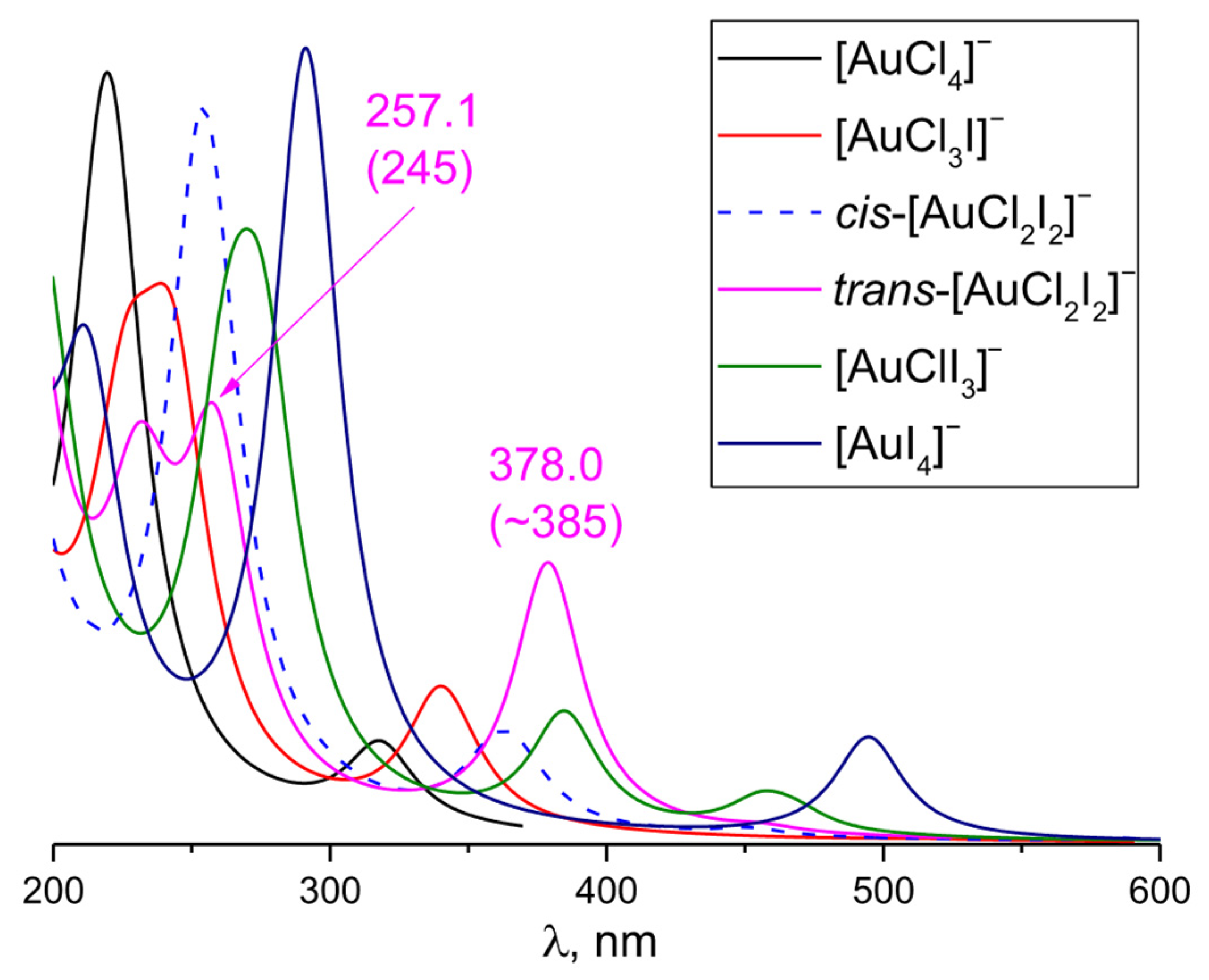 It is well-established that tetrachloroaurate(III) is readily reduced by iodide (see, e.g., paper [16]). Therefore, it was unexpected to find a report [17] claiming the formation of a [AuCl2I2] complex when the molar ratio of gold(III) to iodide is maintained below 0.5. Our computational results (Figure 5) support this claim, as the experimental spectrum from reference [17] agrees well with the spectrum calculated for the trans-[AuCl2I2] isomer.