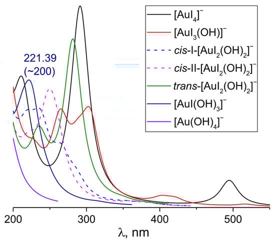A comparison of the theoretical spectra (Figure 6) with the experimental data from reference [17] suggests that the authors may have obtained [AuI(OH)3] rather than [AuI2(OH)2]. This conclusion is based on the fact that the spectrum of trans-[AuI2(OH)2] exhibits a distinct maximum at 281 nm, whereas the experimental UV–Vis spectrum shows only a shoulder at ~300 nm. The formation of the cis-[AuI2(OH)2] isomer, whose spectrum is also similar to the experimental one, seems unlikely, as trans-complexes are generally more stable and complex rearrangement is improbable.