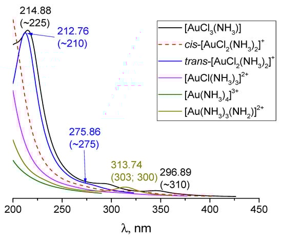 Figure 7. TD-DFT calculated UV–Vis spectra of [AuCl3(NH3)], cis- and trans-[AuCl2(NH3)2]+, [AuCl(NH3)3]2+, [Au(NH3)4]3+, and [Au(NH3)3(NH2)]2+. Experimental values of peaks maxima adopted from Figure 1 in paper [48] for [AuCl3(NH3)], trans-[AuCl2(NH3)2]+, from paper [46], and Figure 1 in paper [45] for [Au(NH3)3(NH2)]2+, are given in parentheses.