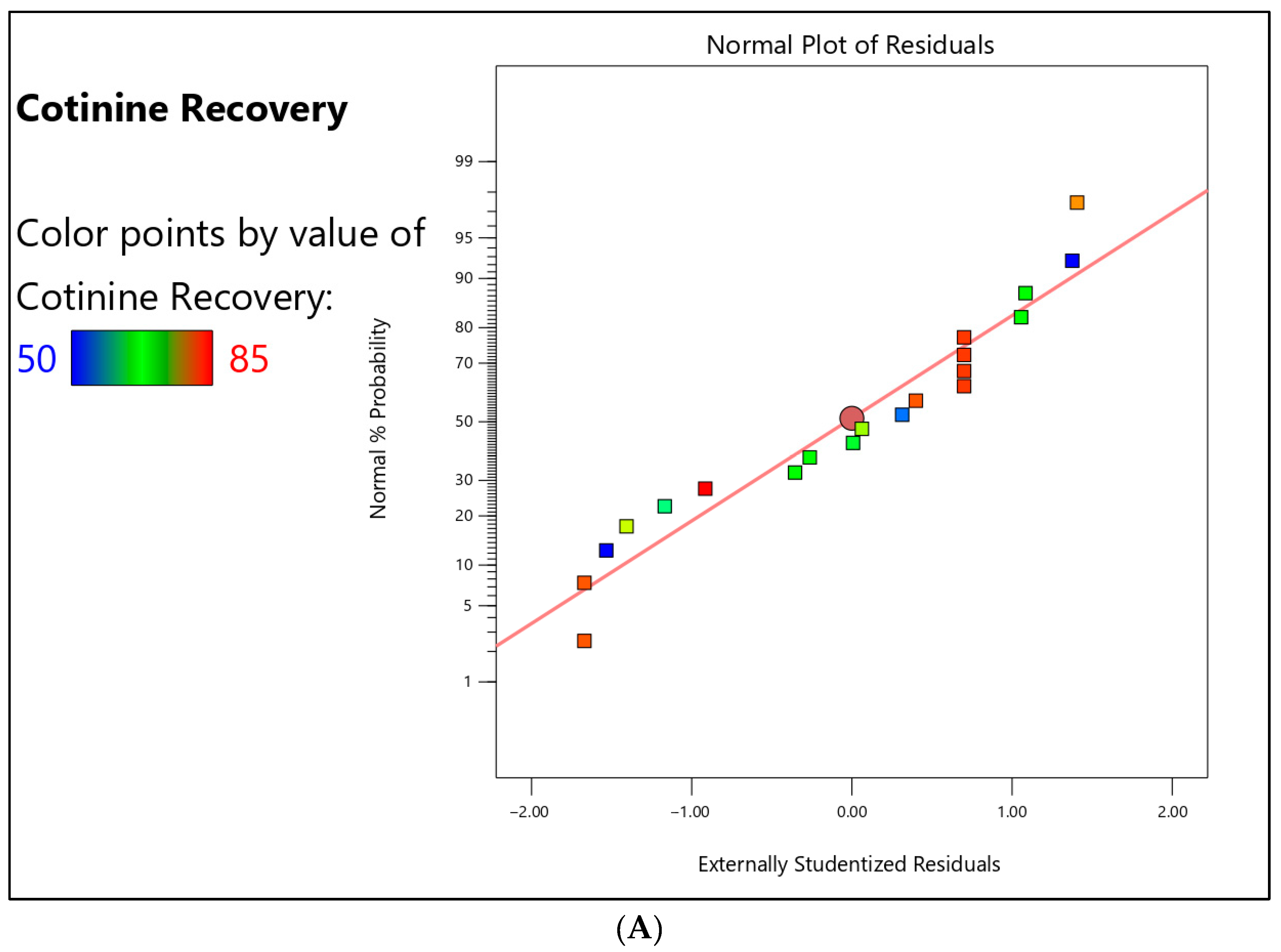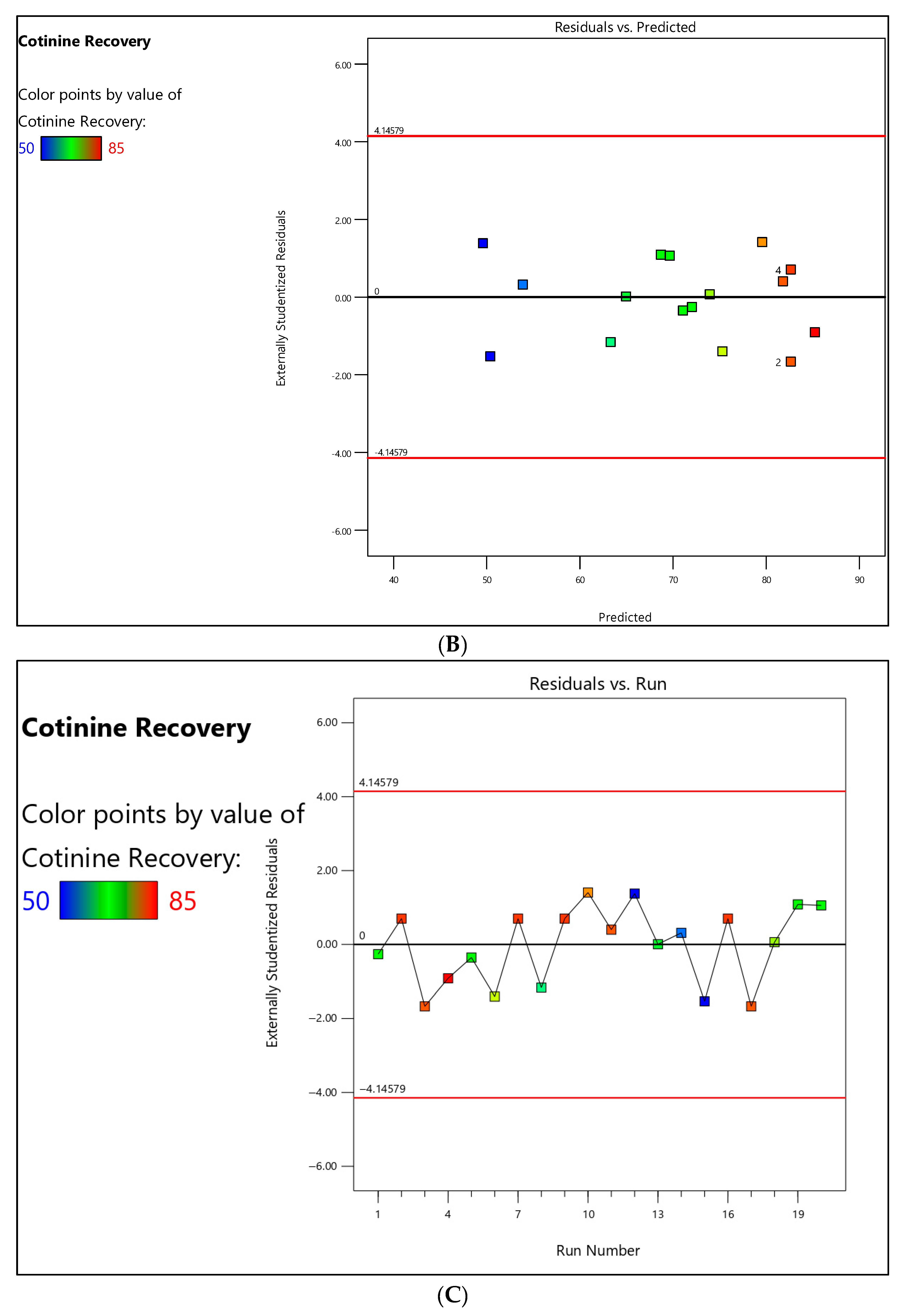 Model predictability was assessed using several statistical indicators. The coefficient of determination (R2 = 0.9990) indicates that the fitted model explains more than 99% of the variability in cotinine recovery, reflecting an exceptionally strong model fit. The adjusted R2 (0.9982), which accounts for the number of model terms, is in close agreement with the predicted R2 (0.9958), with a difference in less than 0.2. This close alignment demonstrates excellent internal consistency and robust predictive performance.