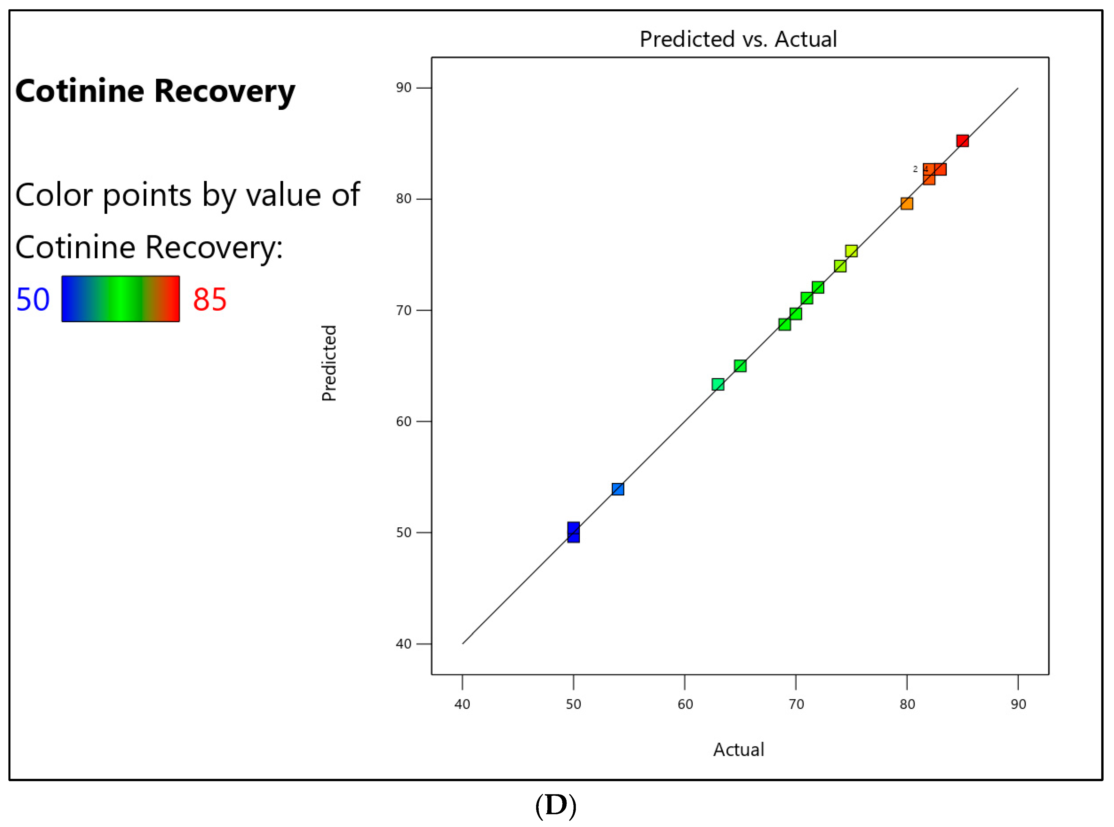 Figure 3D presents the plot of predicted values against experimentally observed values. The close alignment of the data points along the reference line demonstrates strong agreement between predicted and measured responses, indicating that the model accurately captures the relationship between the extraction parameters and cotinine recovery.