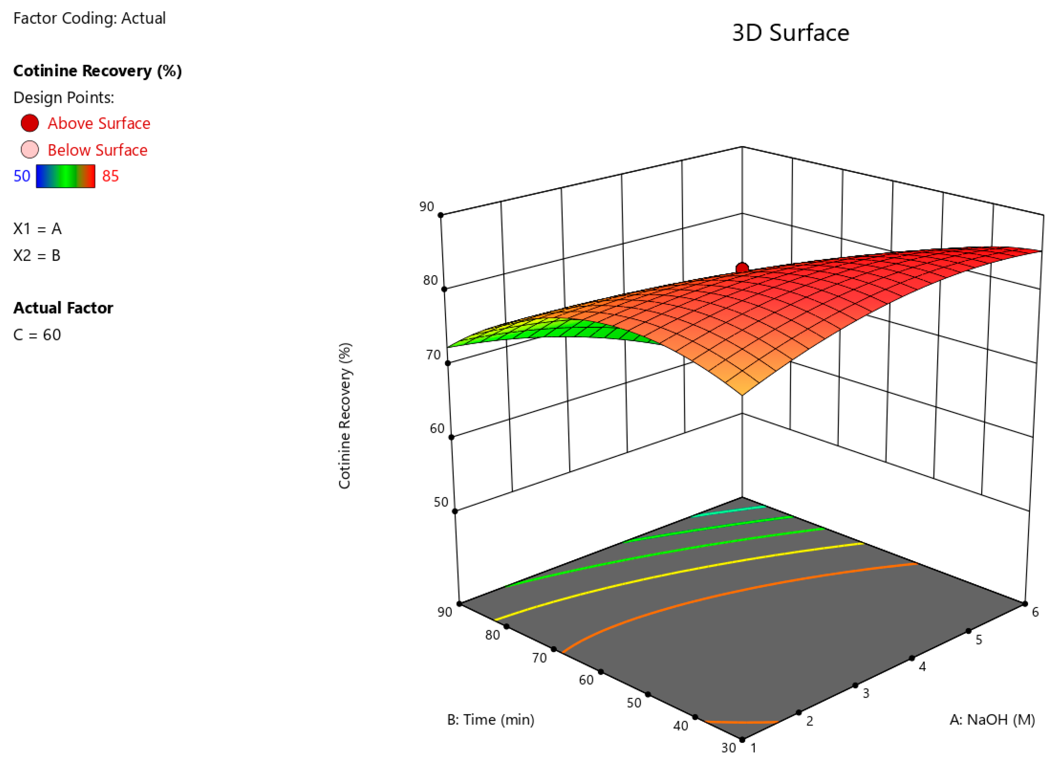 Figure 4 illustrates the three-dimensional response surface depicting the interaction between NaOH concentration (A) and extraction time (B) on cotinine recovery, with extraction temperature (C) held constant at 60 °C. The response surface exhibits a clear upward trend in cotinine recovery with increasing NaOH concentration and extraction time. The red-shaded region corresponds to the highest predicted recovery values, indicating favourable extraction performance, whereas the green and blue regions represent lower recovery yields. The pronounced curvature of the surface reflects a strong interaction between NaOH concentration and extraction time.