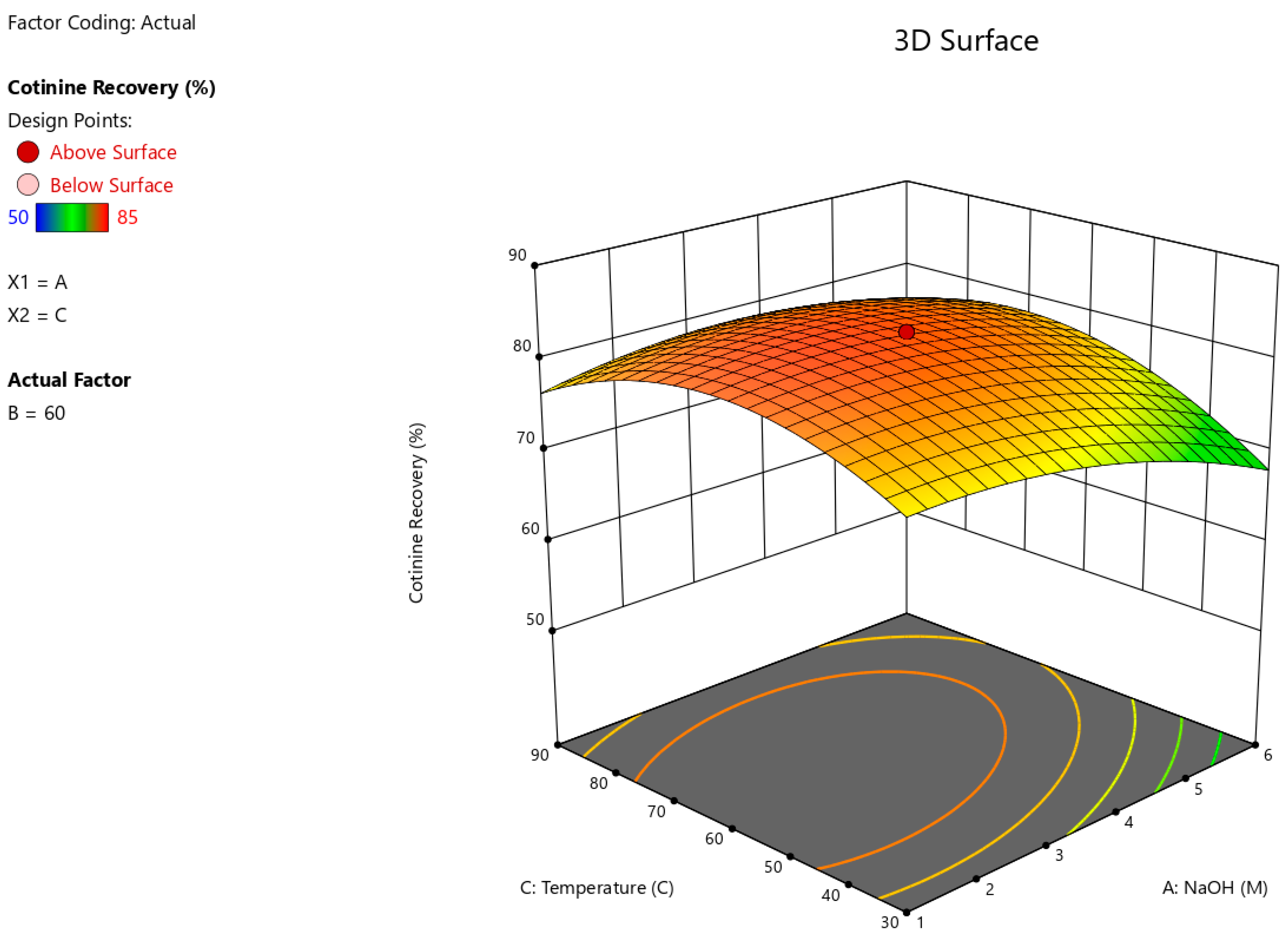 Figure 5 illustrates the combined effects of NaOH concentration (A) and extraction temperature (C) on cotinine recovery, with extraction time (B) held constant at 60 min. The response surface shows a clear increase in cotinine recovery with increasing NaOH concentration, with the highest predicted values occurring at elevated NaOH levels and moderate temperatures. The warm-coloured region (orange to red) denotes the optimal extraction conditions, where cotinine recovery exceeds 80%.