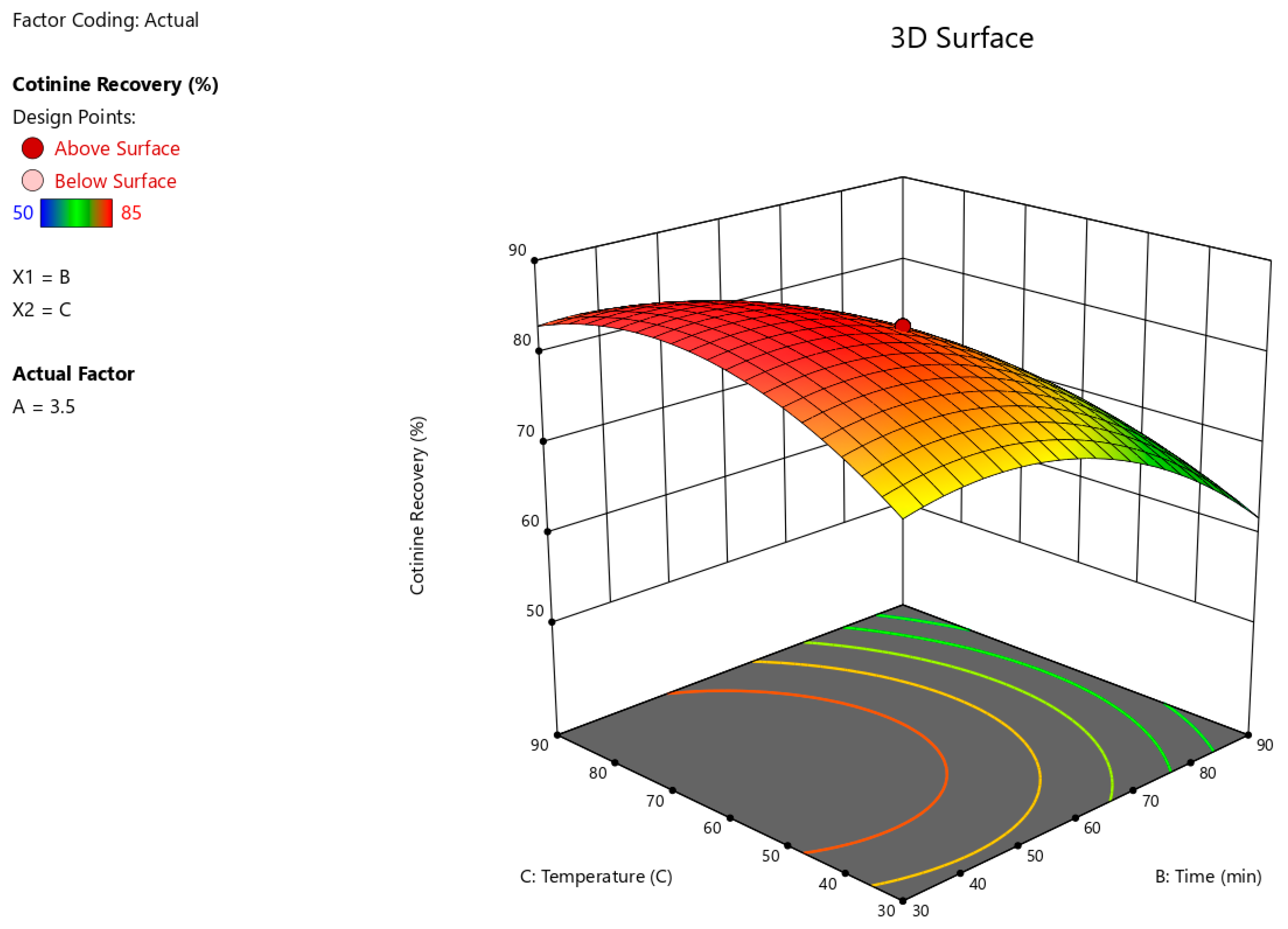 Figure 6 depicts the interactive effects of extraction time (B) and extraction temperature (C) on cotinine recovery, with NaOH concentration maintained at 3.5 M. The response surface exhibits a pronounced curvature, indicating that cotinine recovery initially increases with both factors but begins to decline once the upper limits of extraction time or temperature are exceeded. The red-shaded region denotes the optimal zone of the surface, corresponding to cotinine recovery values exceeding 80%. The plot demonstrates that moderate extraction times (approximately 50–70 min) combined with mid-range temperatures (approximately 50–70 °C) yield the highest recovery.