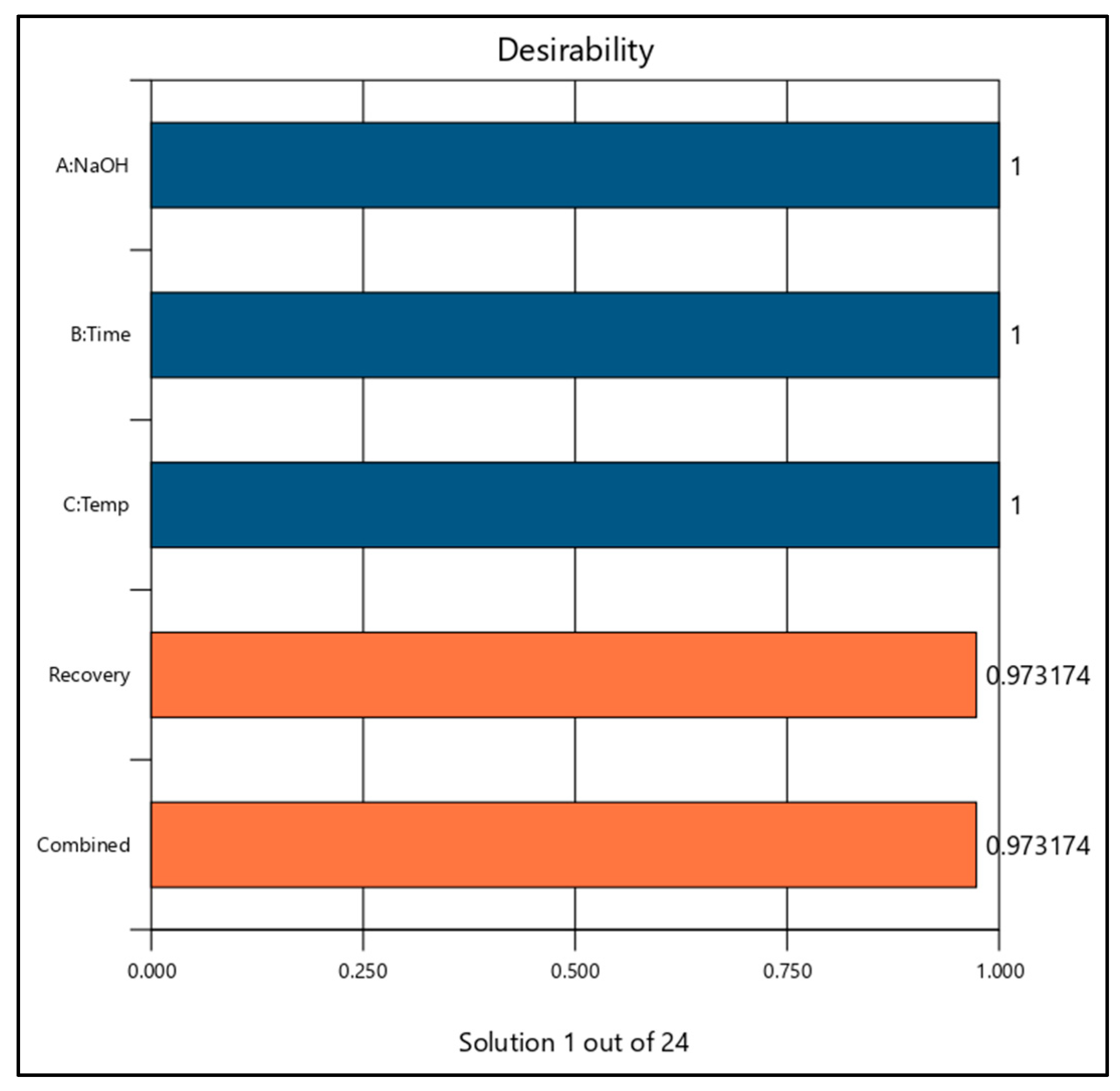 All quadratic terms are negative, demonstrating pronounced curvature in the response surface and indicating the presence of a well-defined maximum within the experimental domain. Among these quadratic effects, extraction temperature and extraction time contribute more strongly to the curvature than NaOH concentration, suggesting that these variables play a dominant role in defining the optimal extraction conditions.