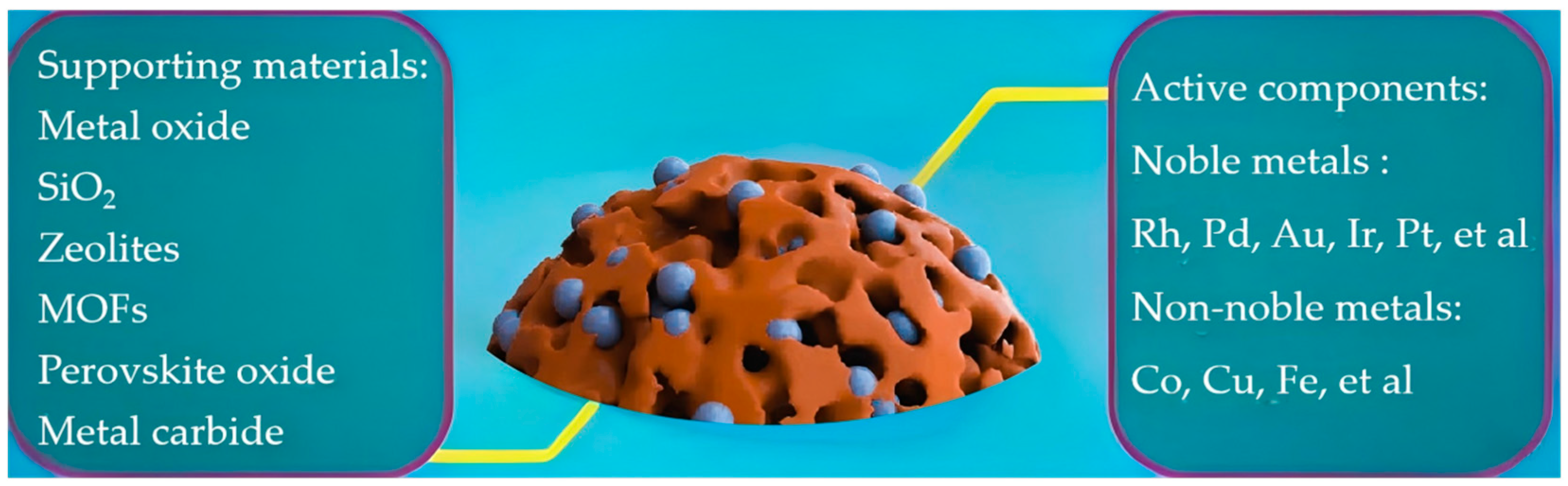 - Tong, X.M.; Han, S.M. Research progress on the effect of supported metal nano-catalysts on catalytic reaction performance. Yunnan Chem. Technol. 2021, 48, 12–13. [Google Scholar]