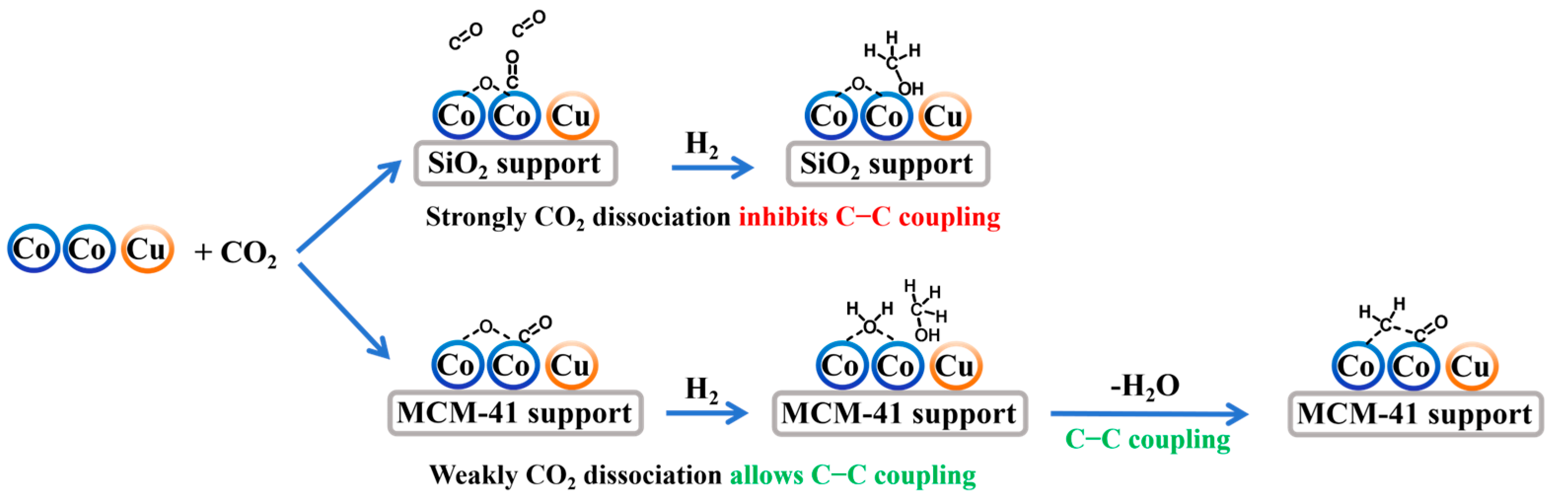 - Wang, Z.Y.; Yang, C.S.; Li, X.H.; Song, X.W.; Pei, C.L.; Zhao, Z.J.; Gong, J.L. The role of CO2 dissociation in CO2 hydrogenation to ethanol on CoCu/silica catalysts. Nano Res. 2023, 16, 6128–6133. [Google Scholar] [CrossRef]
