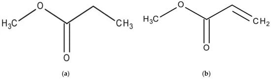 To evaluate the influence of alkyl chain length, two methyl esters with different chain lengths were selected: methyl propionate (C4H8O2) and methyl oleate (C19H36O2). In addition to this, to assess the effect of the degree of unsaturation, esters with identical carbon chain lengths but higher levels of unsaturation were also examined. Specifically, methyl acrylate (C4H6O2) and methyl linoleate (C19H34O2) were included at different concentrations and compared with methyl propionate and methyl oleate, respectively. These reagents were obtained from Sigma Aldrich (St. Louis, MO, USA). The chemical structures of these compounds are presented in Figure 1. Although methyl propionate and methyl acrylate contain the same number of carbon atoms, the former has a lower degree of unsaturation than the latter. Similarly, methyl oleate and methyl linoleate possess the same carbon chain length but differ in their degree of unsaturation, with methyl linoleate exhibiting a higher number of double bonds. Thus, two solutions were used in this research work: one solution included pure methyl propionate containing different concentrations, including 0, 10, 50 and 100 μM, of methyl oleate; another solution consisted of methyl acrylate with different concentrations, i.e., 0, 10, 50 and 100 μM of methyl linoleate.