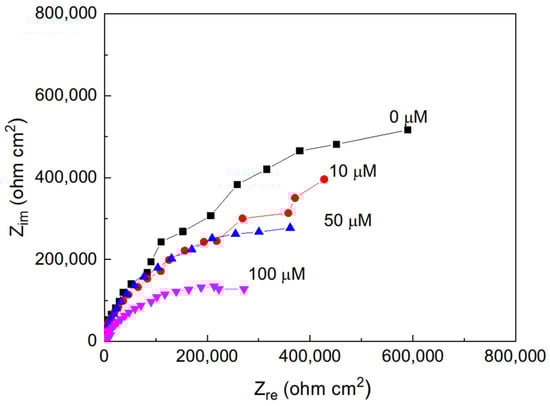 The effect of the addition of different concentrations of methyl linoleate to methyl oleate on the Nyquist plots for Al, displayed a similar trend to that observed for aluminum immersed in methyl oleate with varying concentrations of methyl linoleate (Figure 3), where the impedance response also exhibits capacitive semicircles centered on the real axis. The semicircle diameter decreased with an increase in the methyl linoleate concentration, indicating; thus, an increase in the Al corrosion rate.
