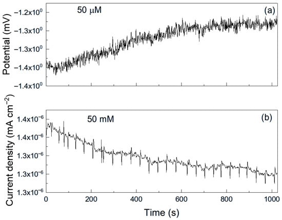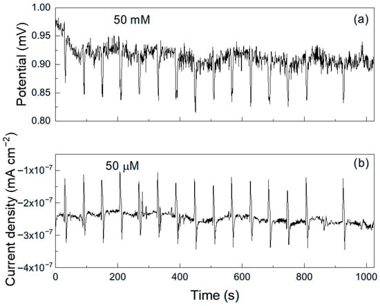 As an example, Figure 6 shows a representative time series of current and potential noise for aluminum exposed to methyl propionate. The data reveal transients of low intensity and high frequency, combined with less frequent transients of higher intensity, which are indicative of the rupture and reformation of a protective film or metastable pitting-type corrosion [33]. When 50 μM of methyl acrylate was added (Figure 7), both the intensity and frequency of the transients increased, suggesting more frequent film rupture and a higher susceptibility of the metal to localized corrosion, such as pitting. These transients result from the cyclical rupture and reformation of protective films on the metal surface. As established above, double bonds and conjugated systems interact strongly with metal d-orbitals, enabling their adsorption onto metal surfaces and, in some cases, the formation of unstable surface complexes. Such interactions can disrupt protective layers and, thus, leave those sites unprotected, giving rise to an increase in the localized corrosion rate, and, therefore, in the current. When the film is repaired and formed again, the current recovers its original value as observed in Figure 7b.