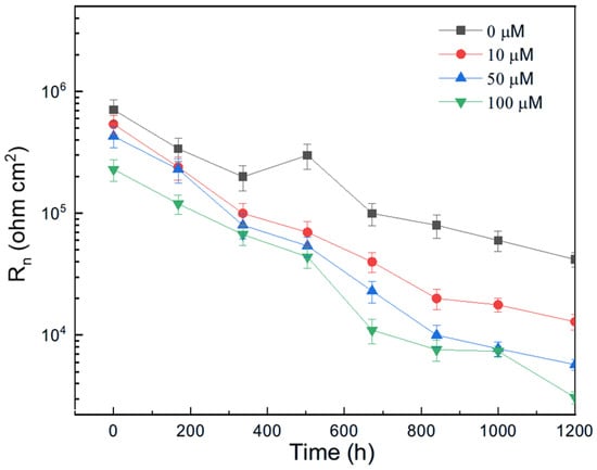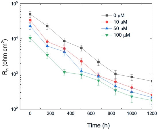 The variation in Rn for pure aluminum immersed in methyl propionate with different concentrations of methyl acrylate is shown in Figure 10, while the effect of adding methyl linoleate to methyl oleate is presented in Figure 11. These figures show that the addition of either methyl acrylate or methyl linoleate reduces the Rn value, and increasing their concentration leads to a further decrease, corresponding to an increase in the corrosion current density (Icorr). Additionally, the presence of a longer alkyl chain also lowers the Rn value. It can be noticed that the Rn values for Al immersed in methyl propionate + methyl acrylate are higher than those in methyl oleate + methyl linoleate, and that, in general terms, an increase in either the degree of unsaturation or the alkyl chain length brings a decrease in the Rn value, indicating an enhancement in the corrosion rate of aluminum.