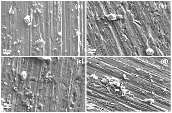 SEM micrographs of aluminum specimens corroded in various methyl ester solutions are presented in Figure 12 and Figure 13. Figure 12 shows specimens exposed to methyl propionate with different concentrations of methyl acrylate. For the specimen immersed in pure methyl propionate (Figure 12a), no visible damage is observed on the metal surface, with only minor corrosion products present, consistent with the current and potential noise time series shown in Figure 6. When 10 μM of methyl acrylate was added (Figure 12b), a few small pits with diameters below 10 μm appeared, along with some corrosion products. As the concentration of methyl acrylate increases (Figure 12c,d), both the number of pits and the amount of corrosion products covering the surface increase, in agreement with the trends observed in the noise time series in Figure 7, indicating enhanced corrosiveness of the solution.