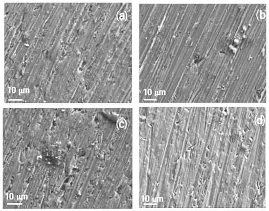 SEM micrographs of Al immersed in methyl oleate with the addition of (a) 0, (b) 10, (c) 50 and (d) 100 μM methyl linoleate.