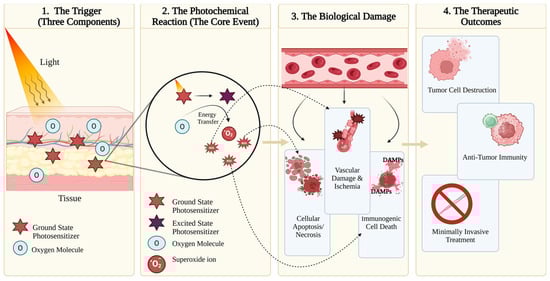 Photodynamic therapy (PDT) is an innovative treatment used to destroy tissues selectively due to a chemical reaction activated by light energy. There are three required components for this reaction to occur: a photosensitizer in the target tissue, a light source, and oxygen. Upon light activation, the photosensitizer undergoes electronic excitation, and transfers energy to surrounding oxygen molecules, generating reactive oxygen species (ROS), predominantly singlet oxygen [*1O2], which induces localized cytotoxic effects and targeted tissue destruction [1,2,3] (Figure 1). The clinical roots can be traced back over a hundred years; however, its modern development has been driven by advances in photochemistry, optical engineering, and molecular biology.