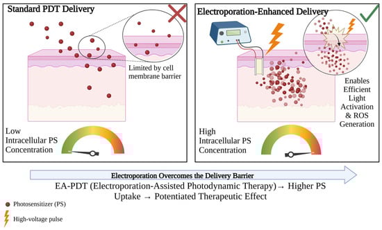 A two-part comparative diagram showing standard versus electroporation-enhanced PDT delivery. Left side depicts conventional PS administration with limited intracellular accumulation due to membrane barriers. Right side shows the EA-PDT process: (1) application of high-voltage electric pulses creating transient pores in cell membranes, (2) enhanced PS influx through these pores, and (3) resulting high intracellular PS concentration. Created in BioRender.