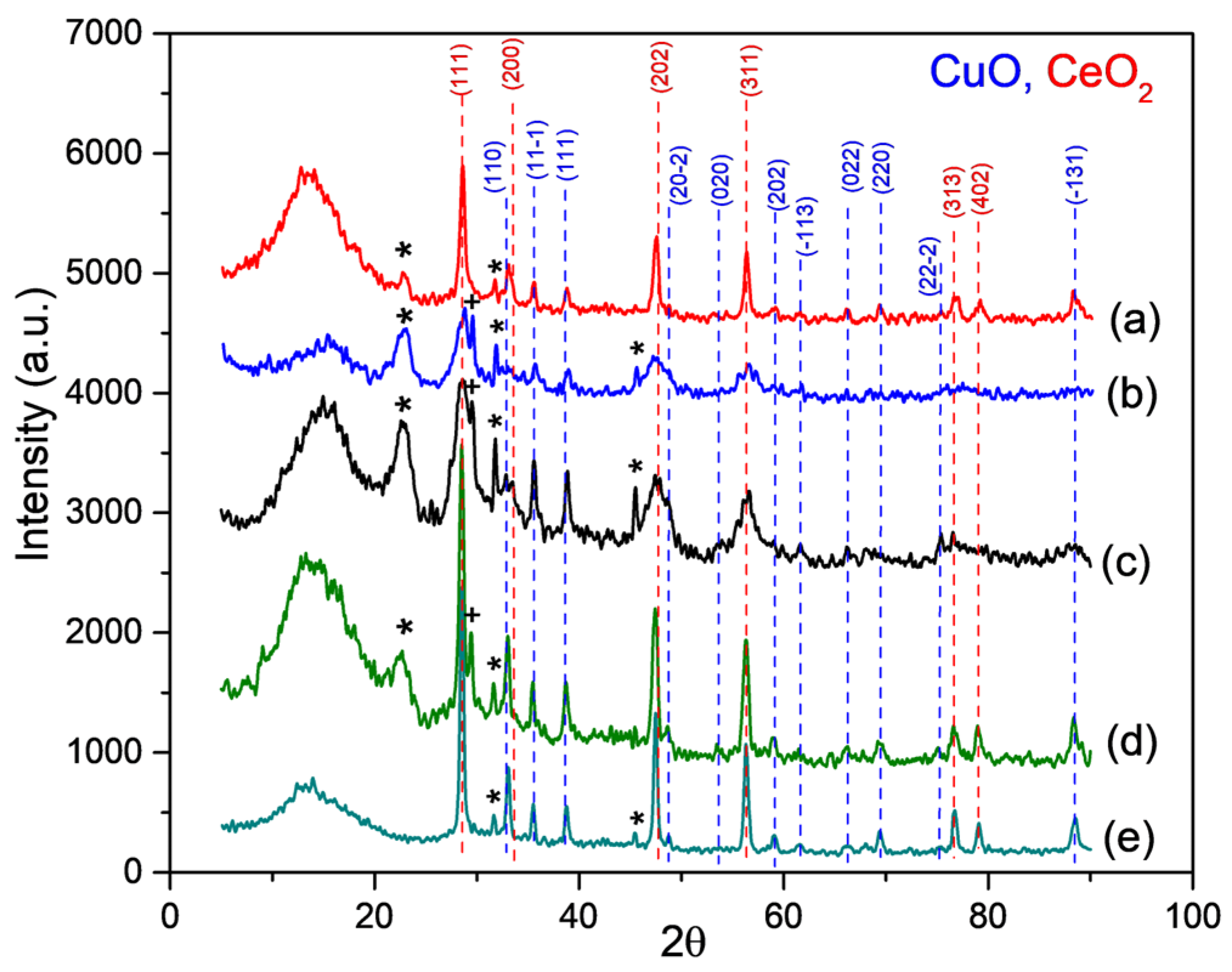 XRD patterns of the CeO2–CuO catalysts calcined at 700 °C with: (a) 10 mol %, (b) 20 mol %, (c) 30 mol %, (d) 50 mol %, and (e) 80 mol % CuO. Marked peaks (+) are for Cu2O and (*) are for CuOH species, respectively.