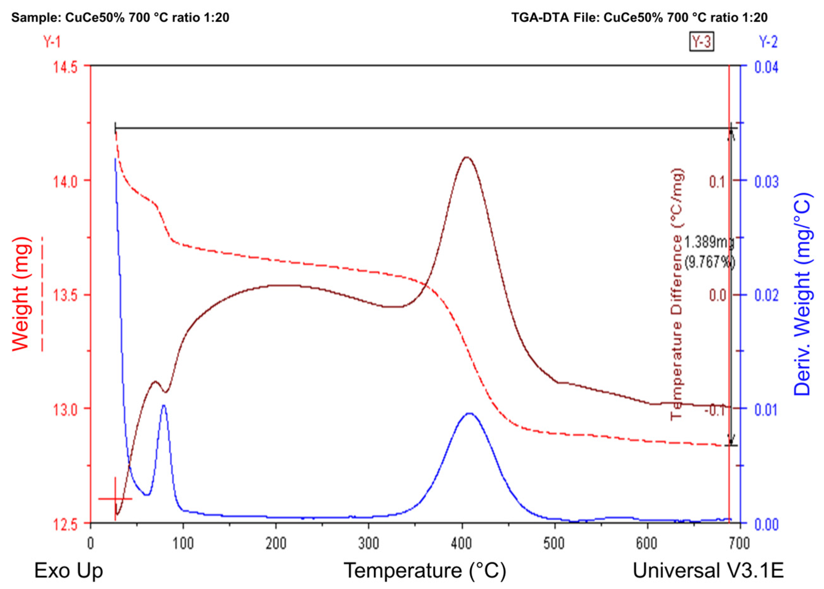 TG/DTG/DTA profiles of Printex oxidation at a Printex-to-catalyst ratio of 1:20, using the Ce–Cu–50 catalyst, calcined at 700 °C.