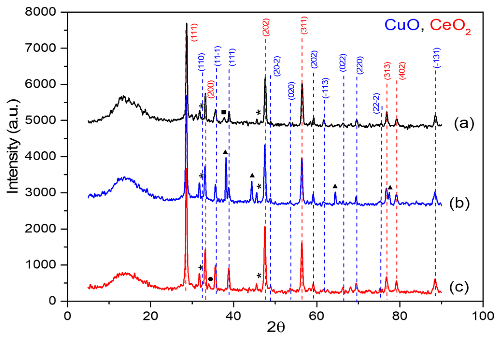 XRD patterns of the CeO2–CuO–50 catalyst promoted with 10 wt.% of (a) Cr2O3, (b) Ag2O, and (c) Fe2O3. All catalysts were calcined at 700 °C. Marked peaks (*) are for CuOH species, whereas Cr2O3 (marked as ■) Ag2O (marked as ▲), and Fe2O3 (marked as ●)are from the promoters.