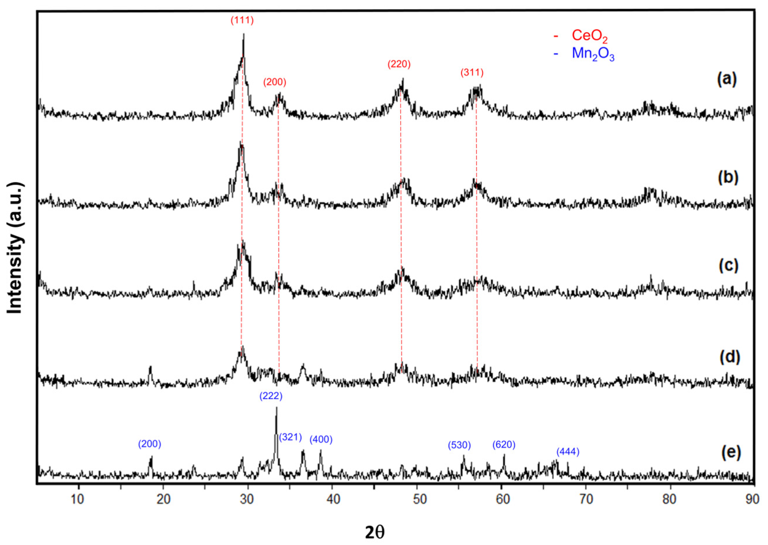 XRD patterns of the CeO2–Mn2O3 catalysts calcined at 600 °C with: (a) 20 mol % Mn2O3, (b) 35 mol %Mn2O3, (c) 50 mol % Mn2O3, (d) 75 mol % Mn2O3, and (e) 100% Mn2O3.