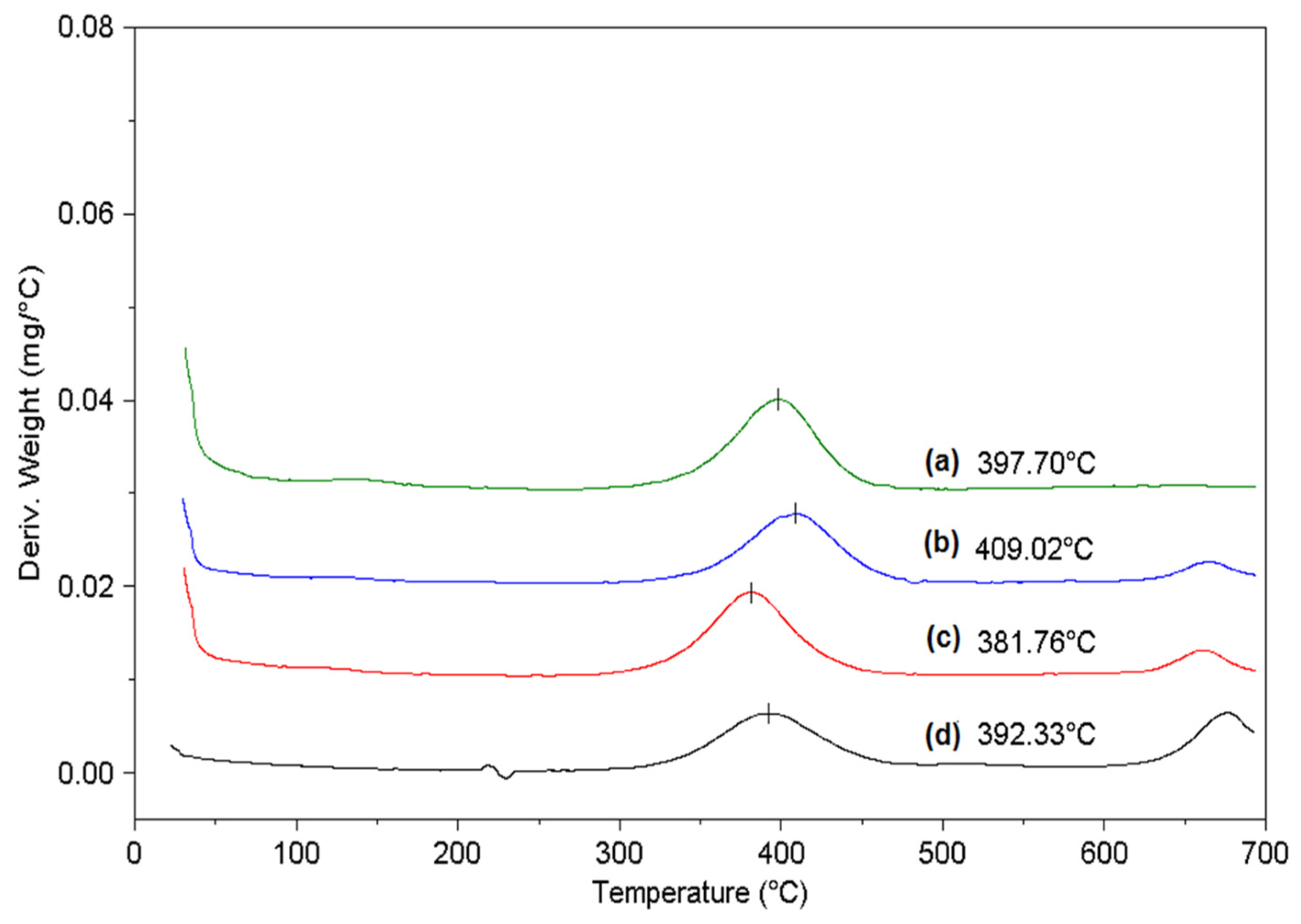 DTG profiles of the Ce–Mn mixed oxide catalysts mixed with Printex, tested at a Printex-to-catalyst ratio of 1:20 under synthetic air: (a) Ce–Mn–20; (b) Ce–Mn–35; (c) Ce–Mn–50; and (d) Ce–Mn–75. All catalysts were calcined at 600 °C.