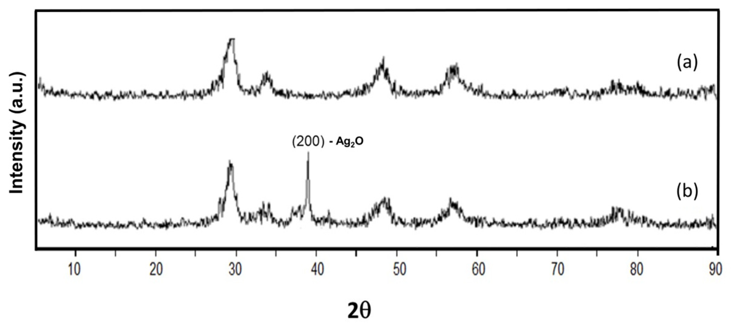 XRD patterns of the Ce–Mn mixed oxide for (a) Ce–Mn–50 and (b) 10 wt.% Ag2O/Ce–Mn–50, showing the plane (200) of Ag2O.