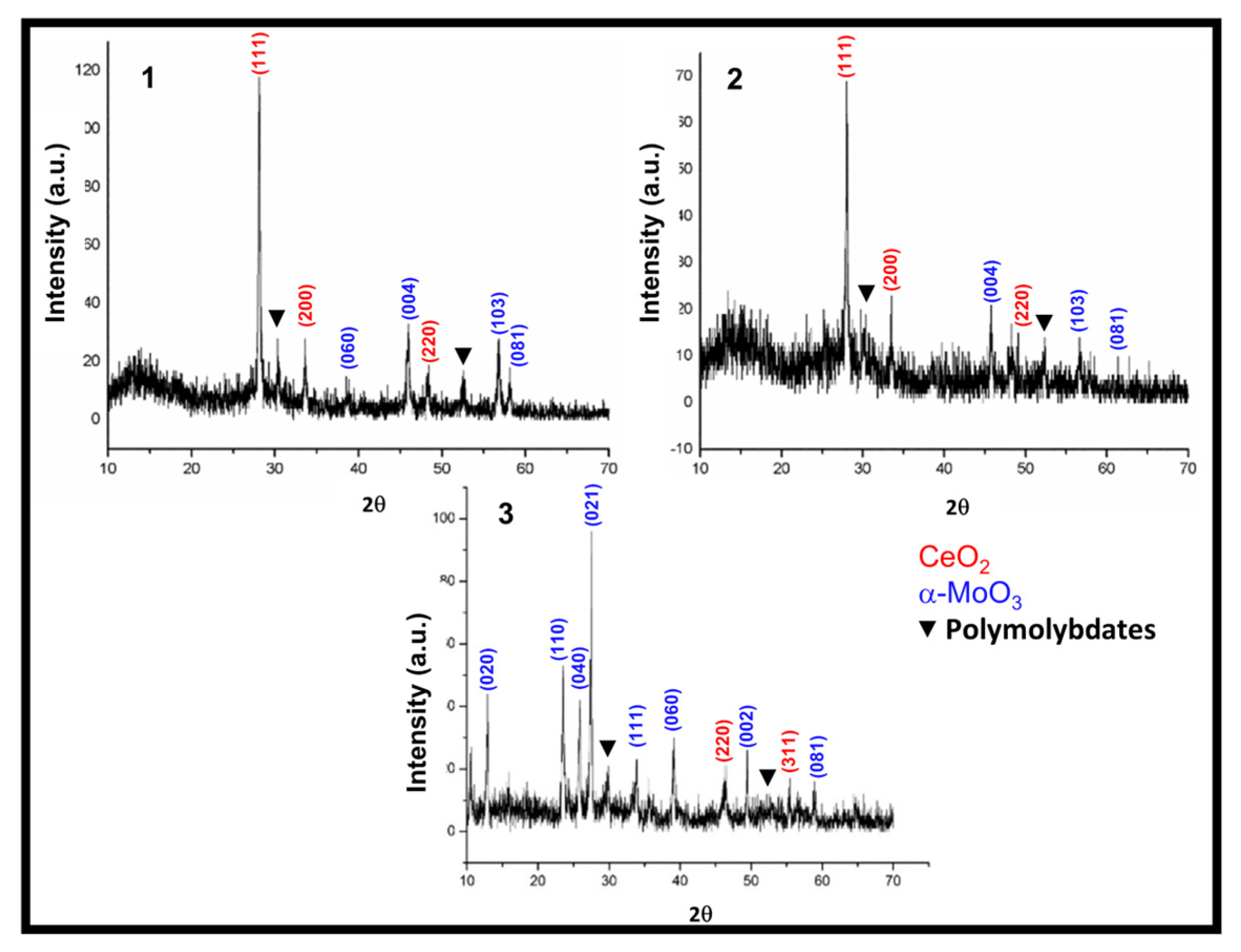 XRD patterns of the Ce–Mo–50 mixed oxide synthesized using different methods: (1) coprecipitation with the cerium precursor added first; (2) co-precipitation with the molybdenum precursor added first; and (3) solid-state synthesis from the precursors.