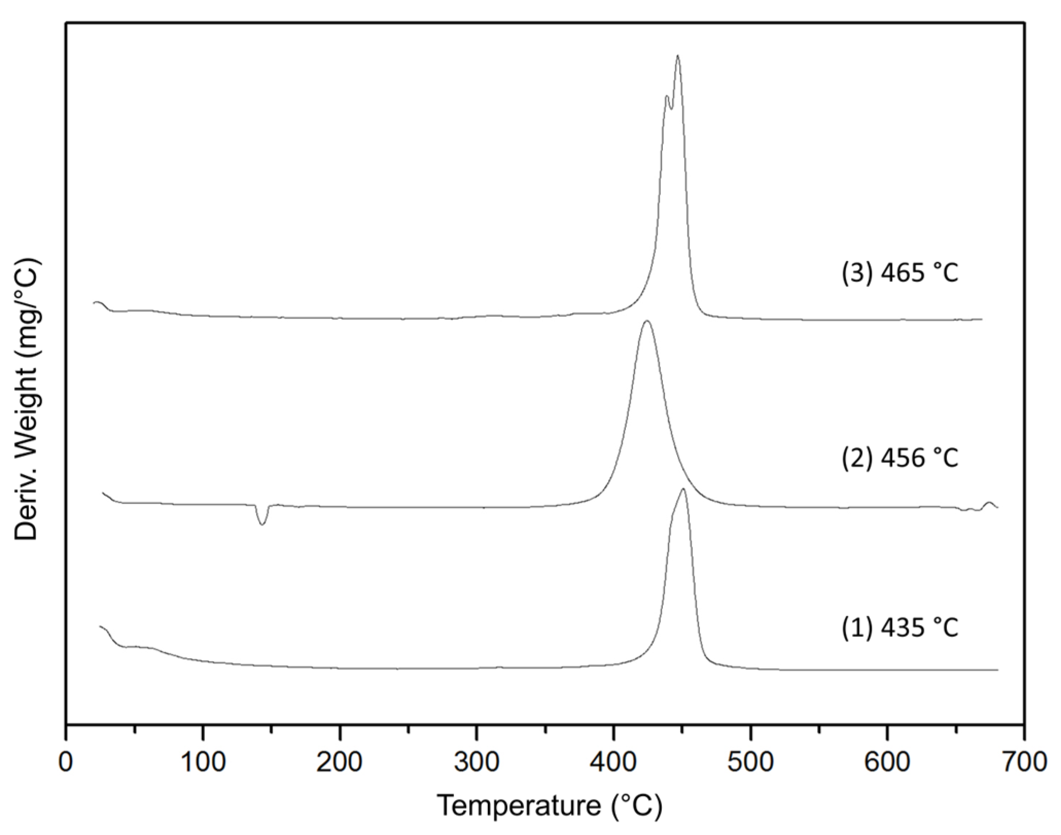 DTG profiles of the Ce–Mo–50 mixed oxide synthesized using different methods: (1) coprecipitation with the cerium precursor added first; (2) co-precipitation with the molybdenum precursor added first; and (3) solid-state synthesis from the precursors.