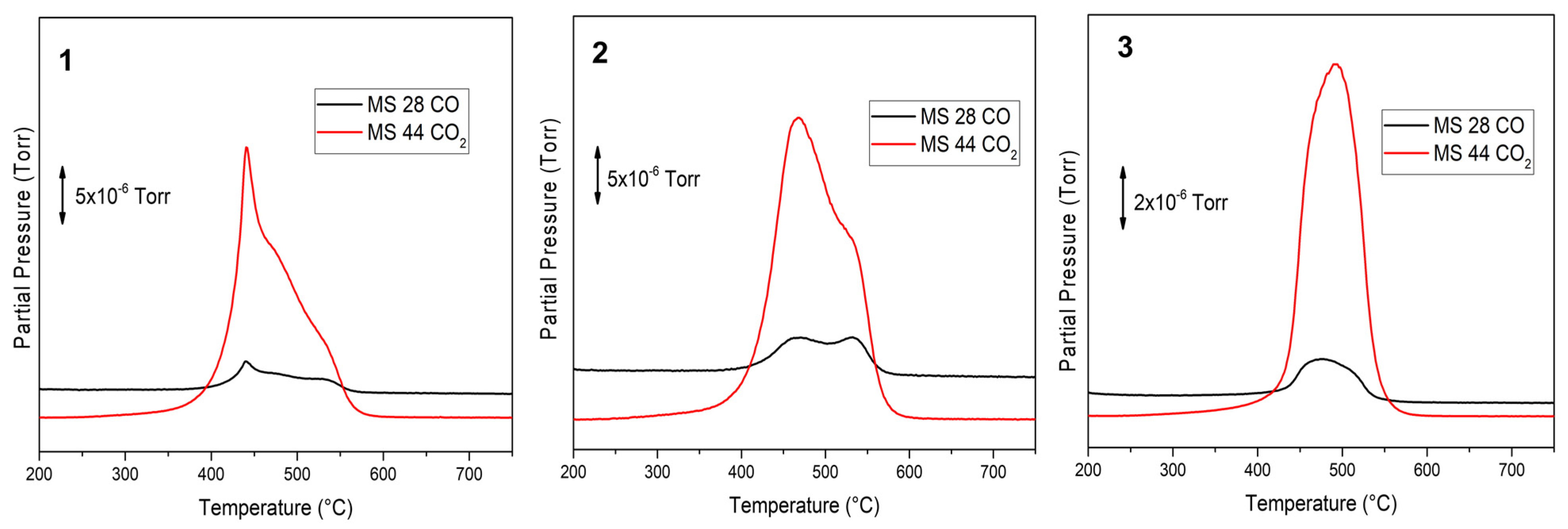 TPO/MS profiles of the Ce–Mo–50 mixed oxide synthesized using different methods: (1) co-precipitation with the cerium precursor added first; (2) co-precipitation with the molybdenum precursor added first; and (3) solid-state synthesis from the precursors. The products were assigned as: (m/e = 28, CO, black line), and (m/e = 44, CO2, red line).