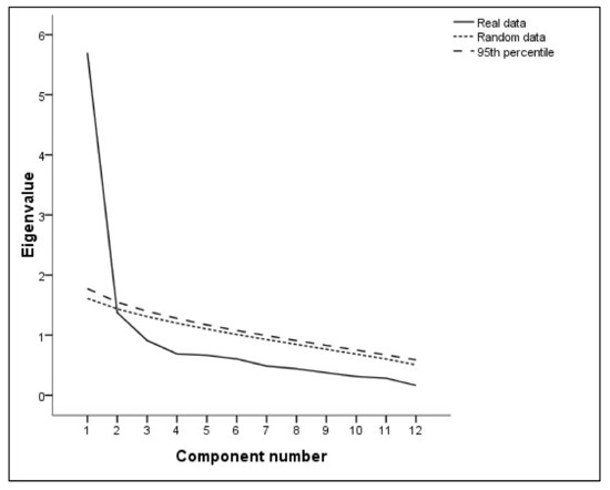 The examination of the scree plot obtained from the PA clearly suggests a one-factor solution (Figure 1); the eigenvalues for the real data are larger than the eigenvalues for the random data. The matrix of the individual factor loadings corresponding to the single-component solution found is presented in Table 2. The test-retest reliability was r = 0.827; the internal reliability using Cronbach’s alpha was 0.868, indicating very good internal reliability.